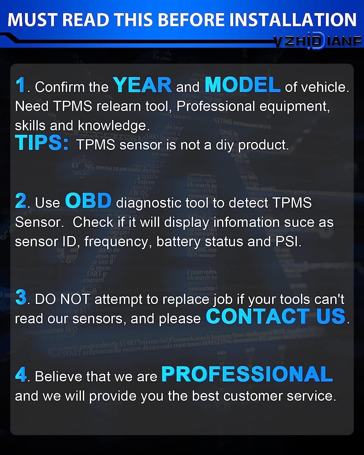 NOTE: YZHIDIANF TPMS is Pre-Programmed, DON’T NEED TO PROGRAMMED AGAIN. And the tire sensors are manufactured to OEM specification, it is very easy to install. After installation, you just need to activate them with scan tool. If you are going to a repair shop to install, PLEASE DON’T LET THE REPAIR SHOP REPROGRAM, JUST NEED TO ACTIVATE THEM WITH SCAN TOOL! If you encounter one or two tire pressures that cannot be used, please feel free to C-O-N-T-A-C-T us
