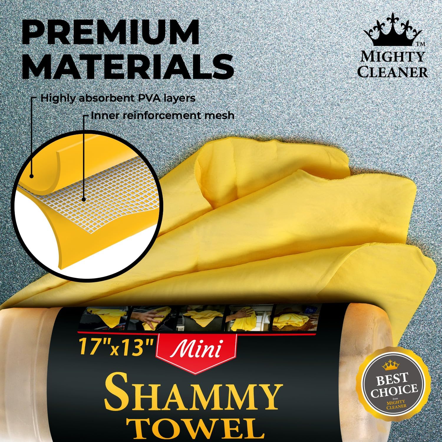 MINI TOWELS (17”x13”) – The Mighty Cleaner car shammy for drying is the best choice for small surfaces like your car’s mirrors or chrome accessories. This compact synthetic chamois fits perfectly in any storage compartment in your vehicle. Showcase your car while driving around in style, impressing everyone because you look your best while keeping your vehicle clean and spotless.