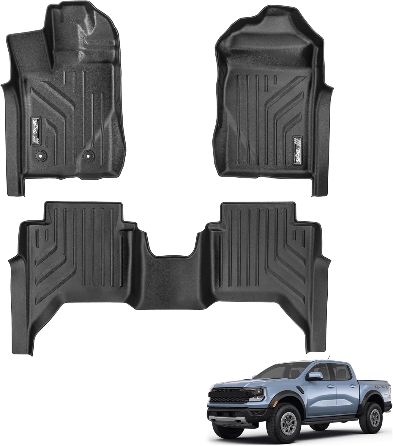 CUSTOM FIT FORD RANGER ACCESSORIES PRECISION DESIGN Upgrade your truck with Official MAXPRO Ford Ranger floor mats for 2024 2025 2026 Ford Ranger and Raptor SuperCrew Cab models with carpeted flooring. Using 3D laser scanning for custom fit floor mats that provide a factory look for every driver and passenger while protecting original carpet from rain snow and mud. These laser fit floor liners stay securely in place without sliding during off-road adventures or daily hauls making them essential Ford Ranger accessories for owners seeking edge-to-edge floor protection and a seamless interior finish that matches the rugged contours of your pickup truck cabin for a perfect fit every time.