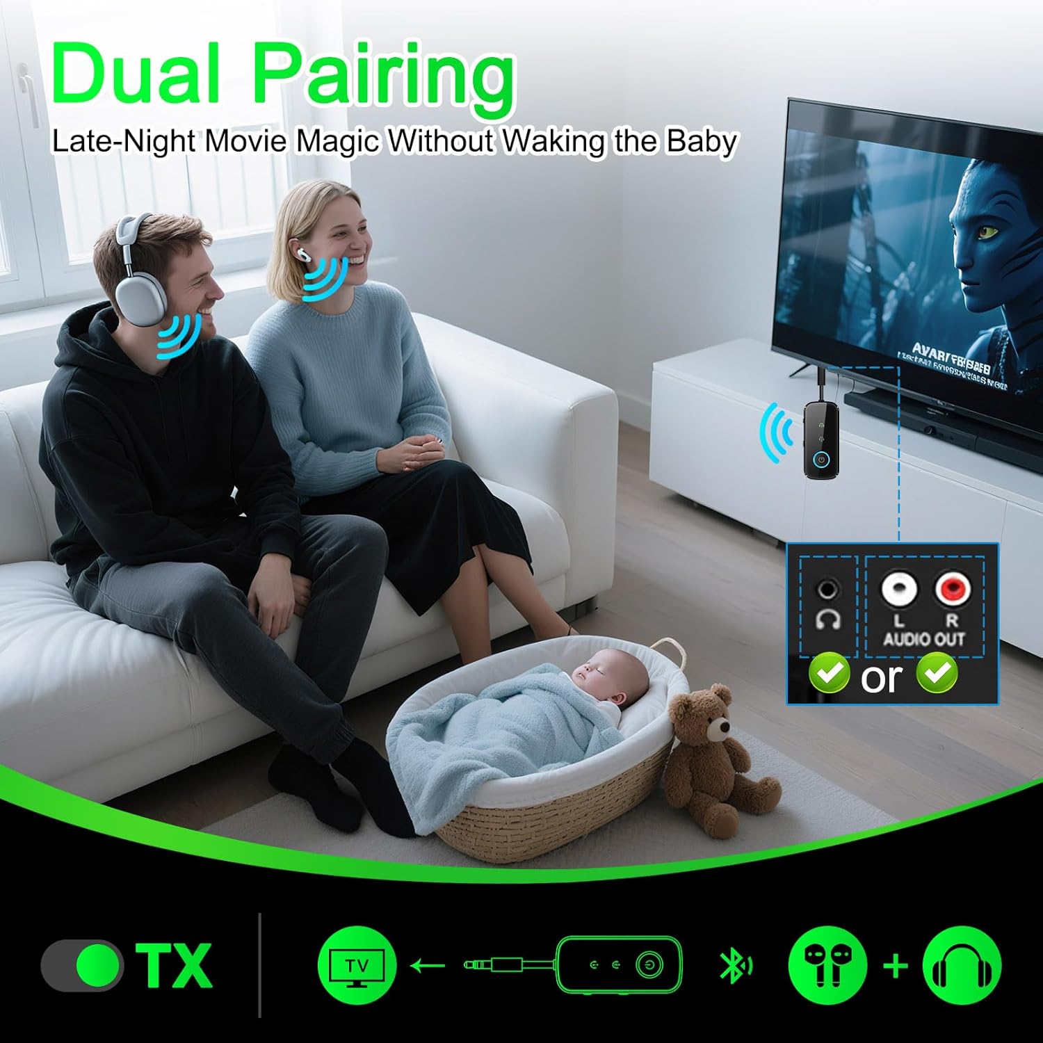 This Bluetooth transmitter works perfectly and is very easy to use. I connected it to my TV and airplane audio system without any problems. The sound quality is clear and stable, and there is almost no delay. I love that it can connect to two headphones at the same time, which is great for traveling or watching movies together. The battery lasts a long time, and the compact design makes it easy to carry anywhere. Excellent product and very useful for everyday and travel use. Highly recommended!