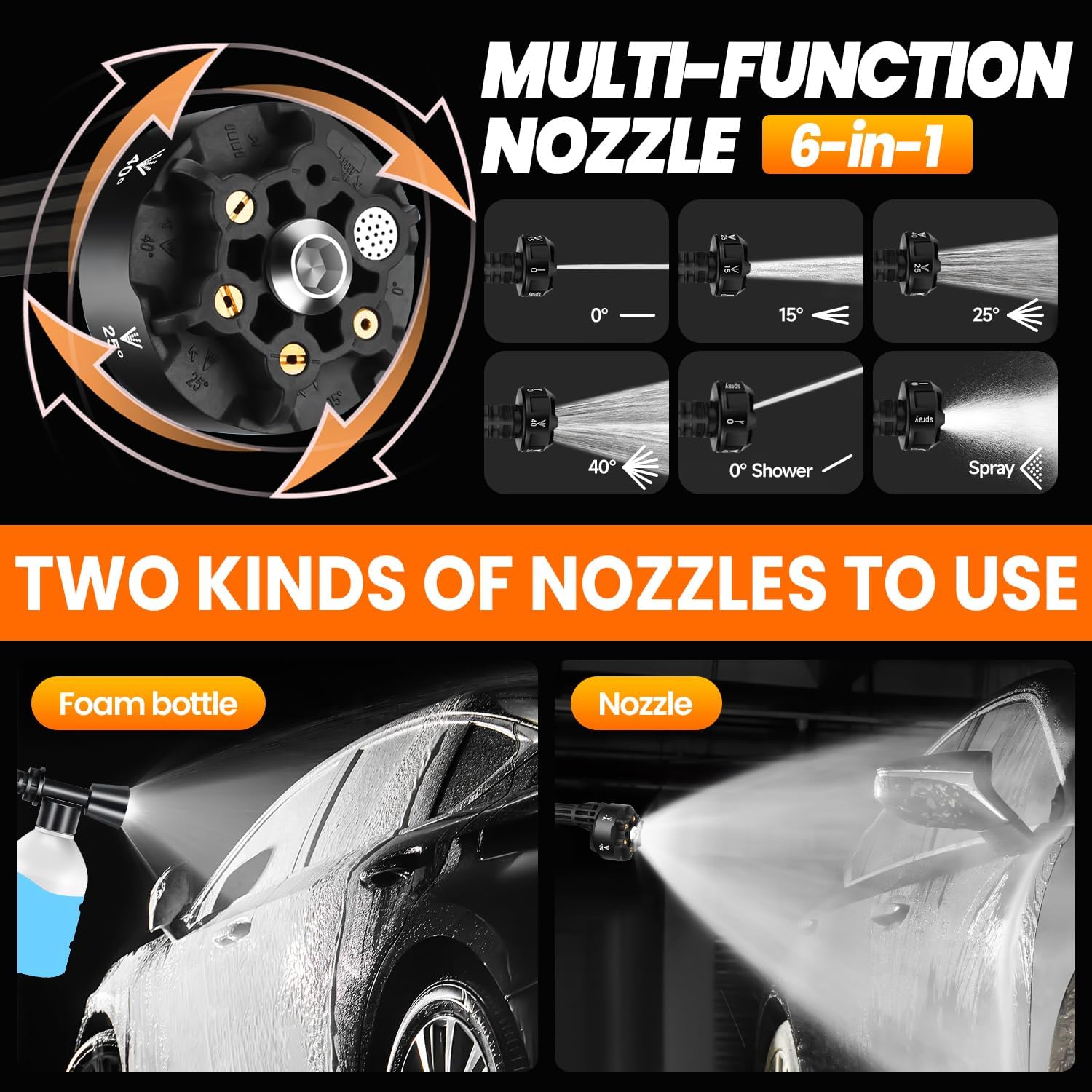 【Various Nozzle】The power washer for cars is equipped with a 6-in-1 nozzle, you can easily switch between nozzles for different cleaning tasks, achieving optimal cleaning results. The car pressure washer is equipped with a foam pot for quick foaming, which is easy to clean cars and clean stains such as windows and doors.