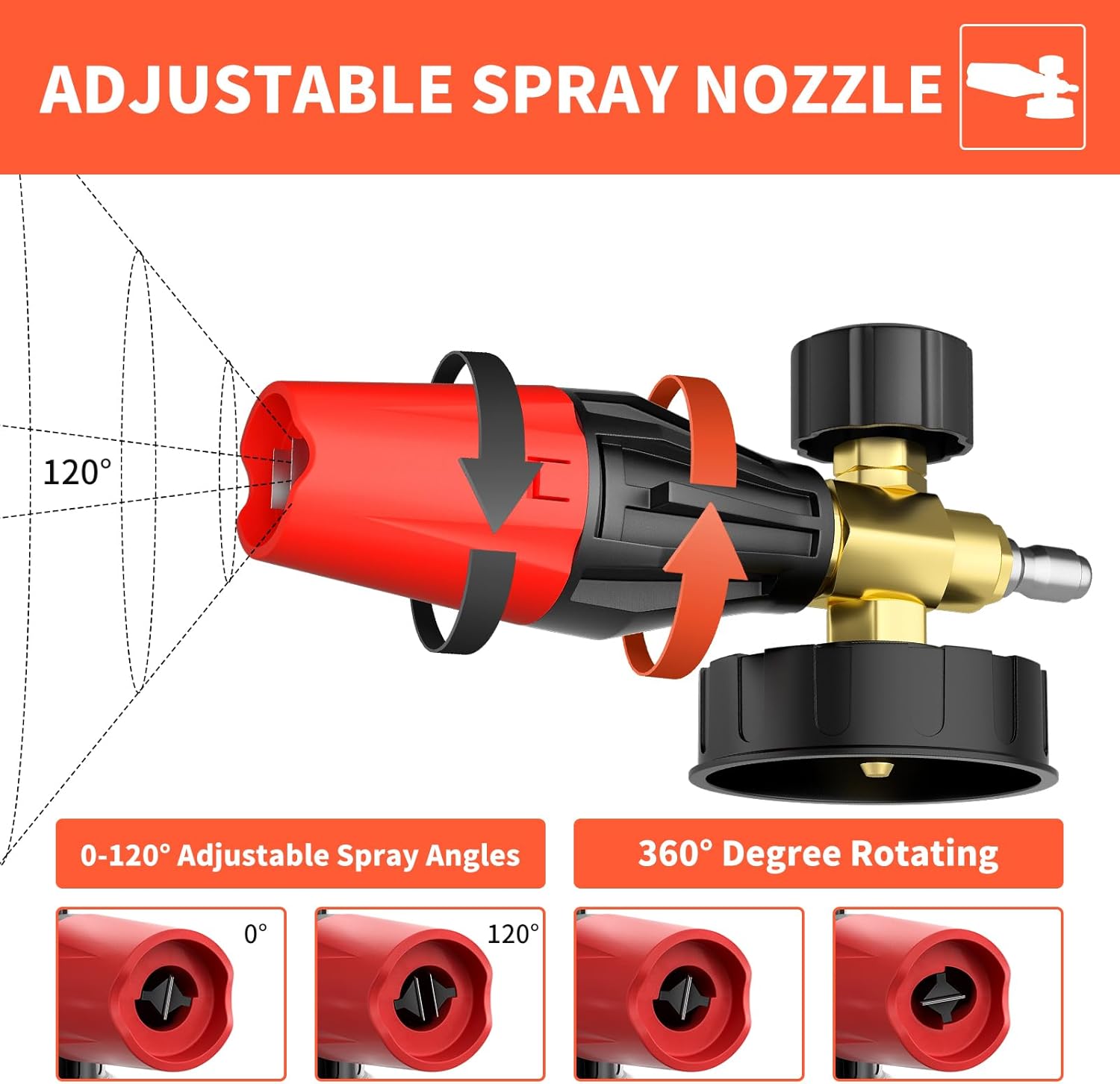 【Adjustable Snow Foam Cannon】Connect the 1/4″ quick-connect plug to the high-pressure cleaning gun or rod to start cleaning. The snowflake sprayer can adjust the foam concentration and spray angle to improve the thick coverage of the foam. Specification: 1000 PSI to 3000 PSI. Container Capacity: 1 Liter / 0.22 Gallon.