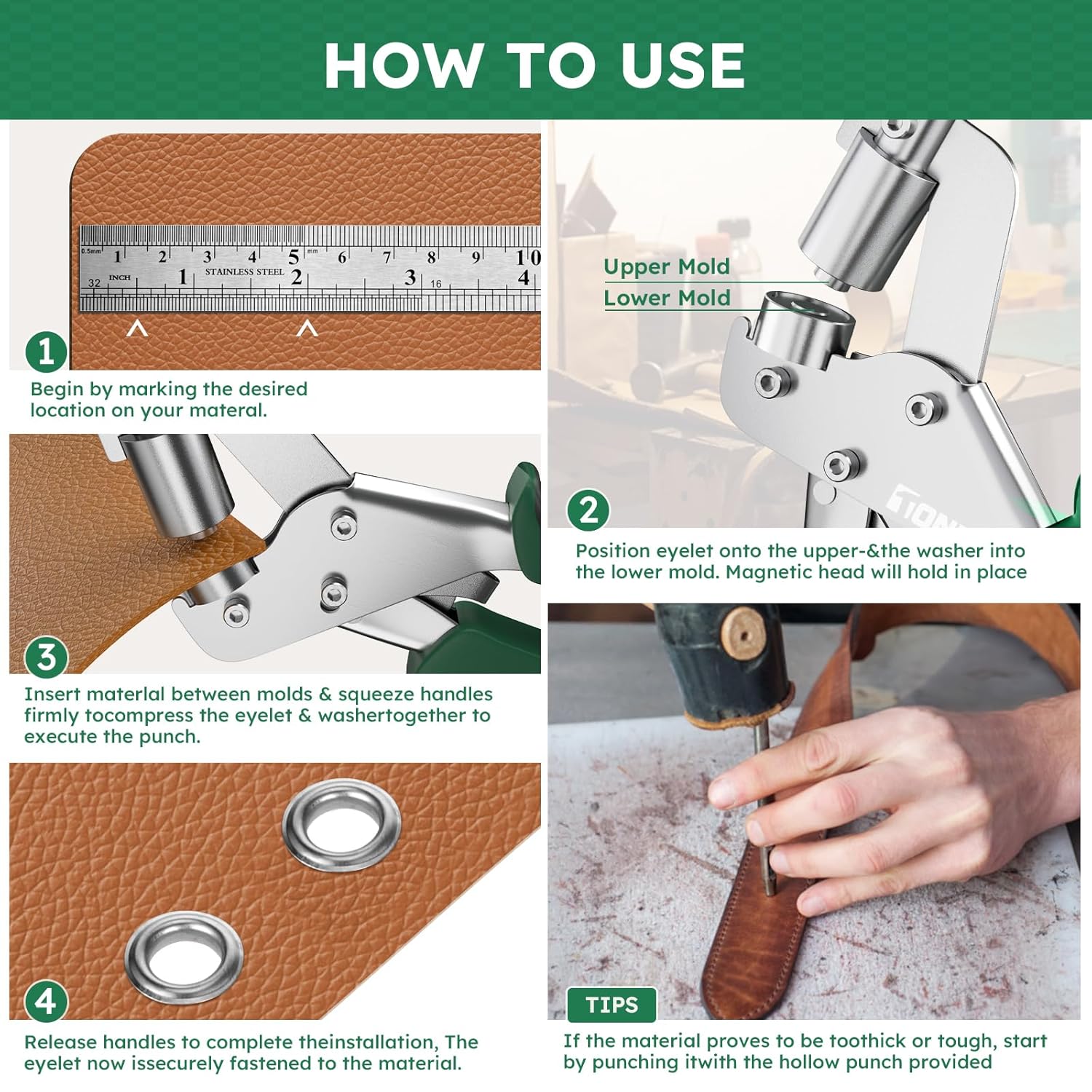 【Versatile Use – From Tarps to Crafts】Securely install eyelets on PVC banners, marine covers, curtains, and DIY crafts with magnetic precision. Whether reinforcing tents, flags, or leather goods, this tool guarantees zero fraying and industrial-strength holds—a must-have for home repairs, professional crafts, and outdoor gear maintenance.