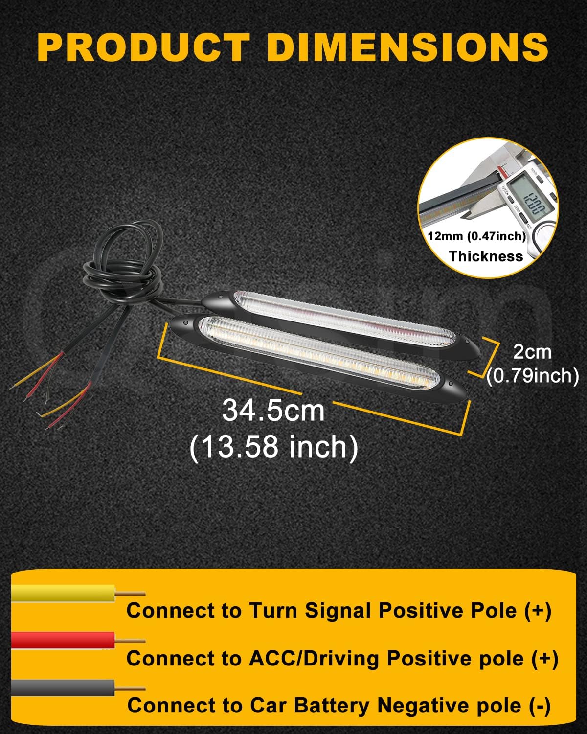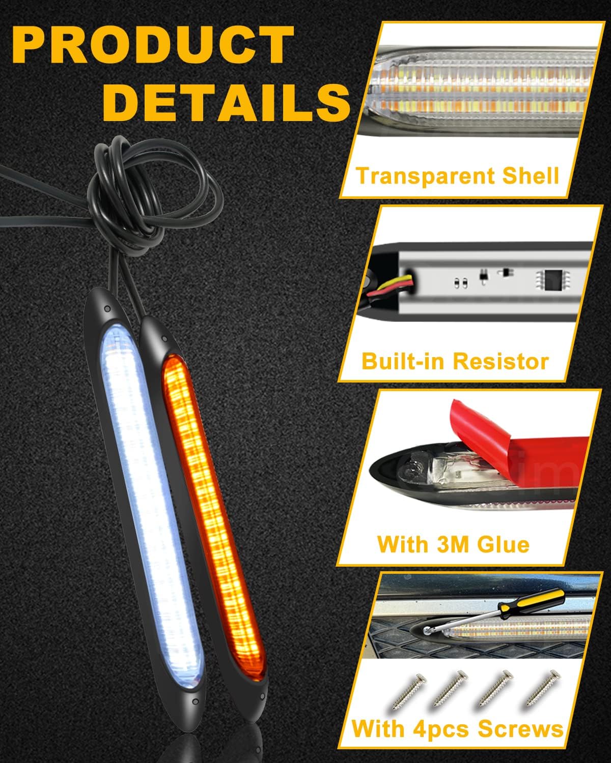 Color: White+Amber,Voltage: 12V,Size: 34.5cm( 13.6 in )*2cm( 0.78 in )*1.2cm( 0.47 in ),Working Temperature: -40~50 ℃,Suitable: Universal for all Cars/Motorcycles/Scooters,etc.Package includes 2pcs 13.6inch light strips +4pcs screws +2pcs 3M glues