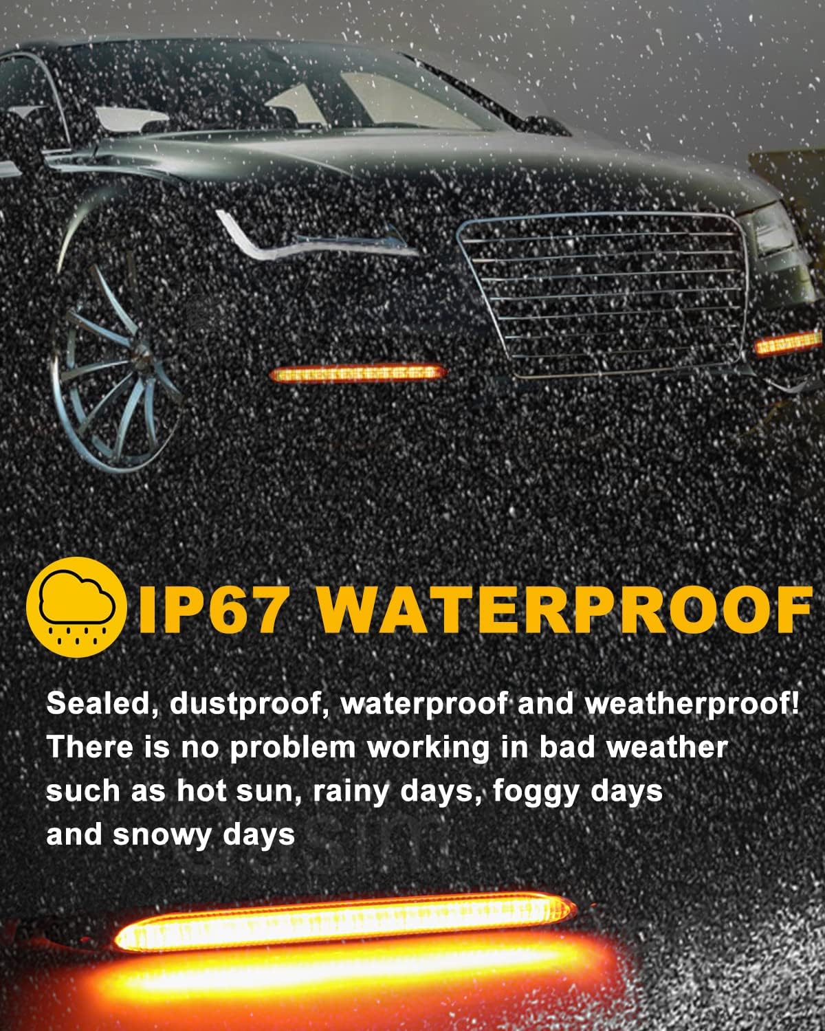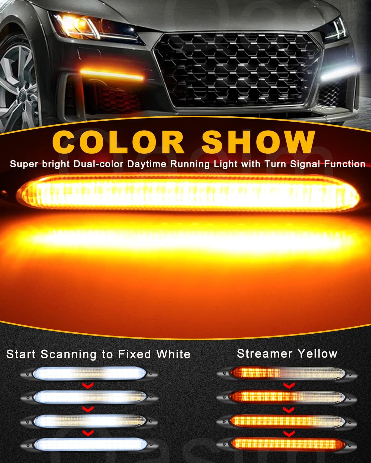 Features: Waterproof ,special soft rubber material, flexible installation, anti-collision! The two-color design can better meet your needs!(Sequential Flow Turn Signal + DRL),Easy to install anywhere on the vehicle. Just measure the size!