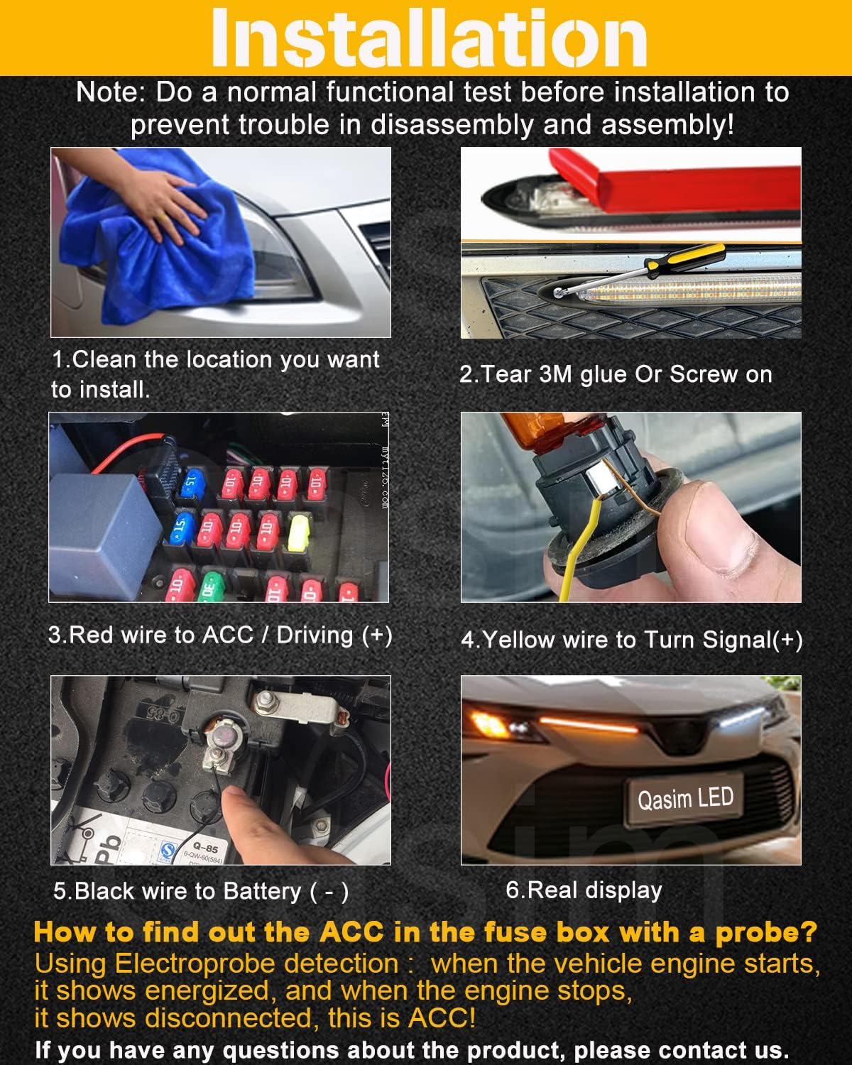 Wire Connection: Black wire: connect to car battery Negative pole (-),Red Wire: connect to ACC/Driving Positive pole (+),Yellow wire: connect to Turn Signal Positive Pole (+) When the daytime running light is turned on, it will start to scan for white, and then it will be a normally bright white.Bright yellow when the turn signal is turned on (streamer scanning sequentially)