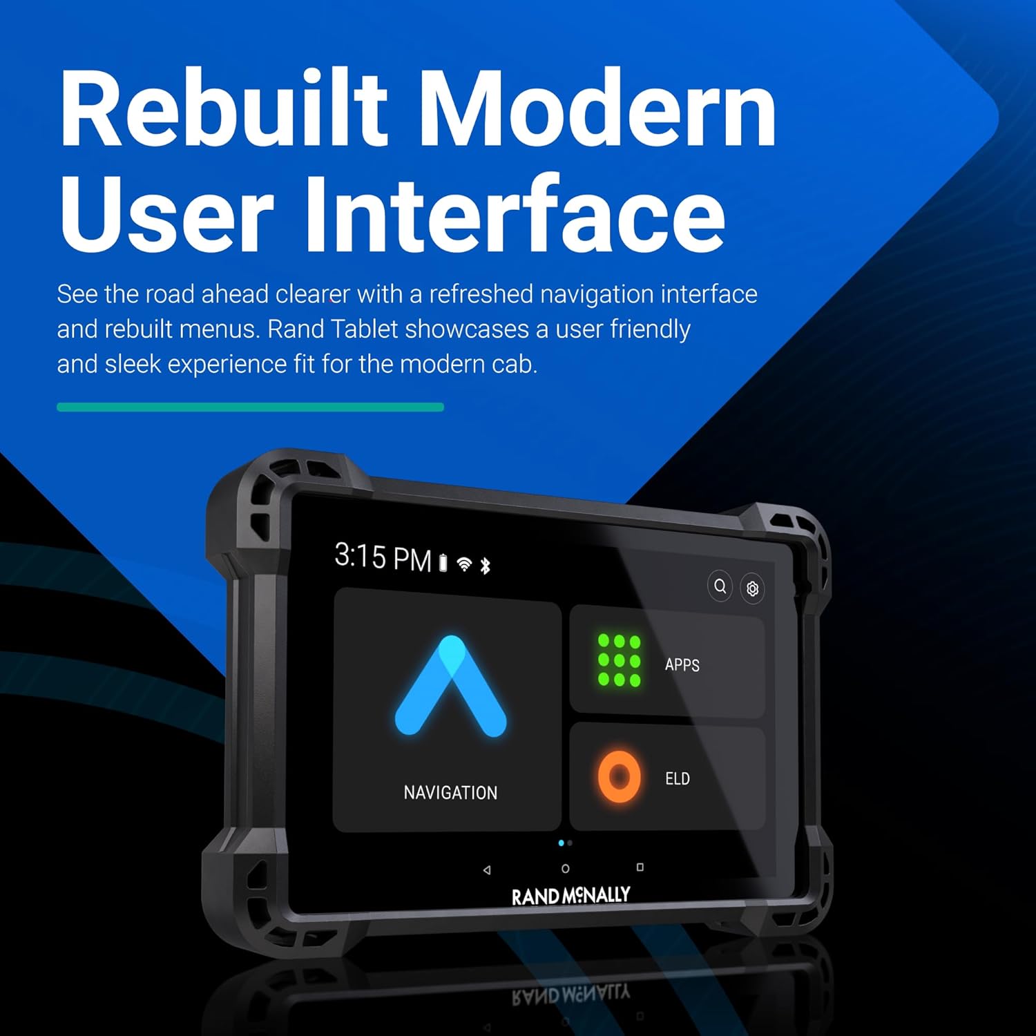 The Rand Tablet features Rand Navigation, an upgraded navigation software for truck drivers. The navigation features a sleek and modern interface, with smooth transitioning of high-resolution visuals. Drivers can follow more comprehensive routes consisting of 3-D renderings of nearby buildings and landmarks, more prominent exits and highways, highly-detailed weather overlays, and crowd-sourced POI reviews. In addition, drivers can still access the many helpful truck tools used in the original navigation, like toll costs, traffic updates, service alerts, and more.