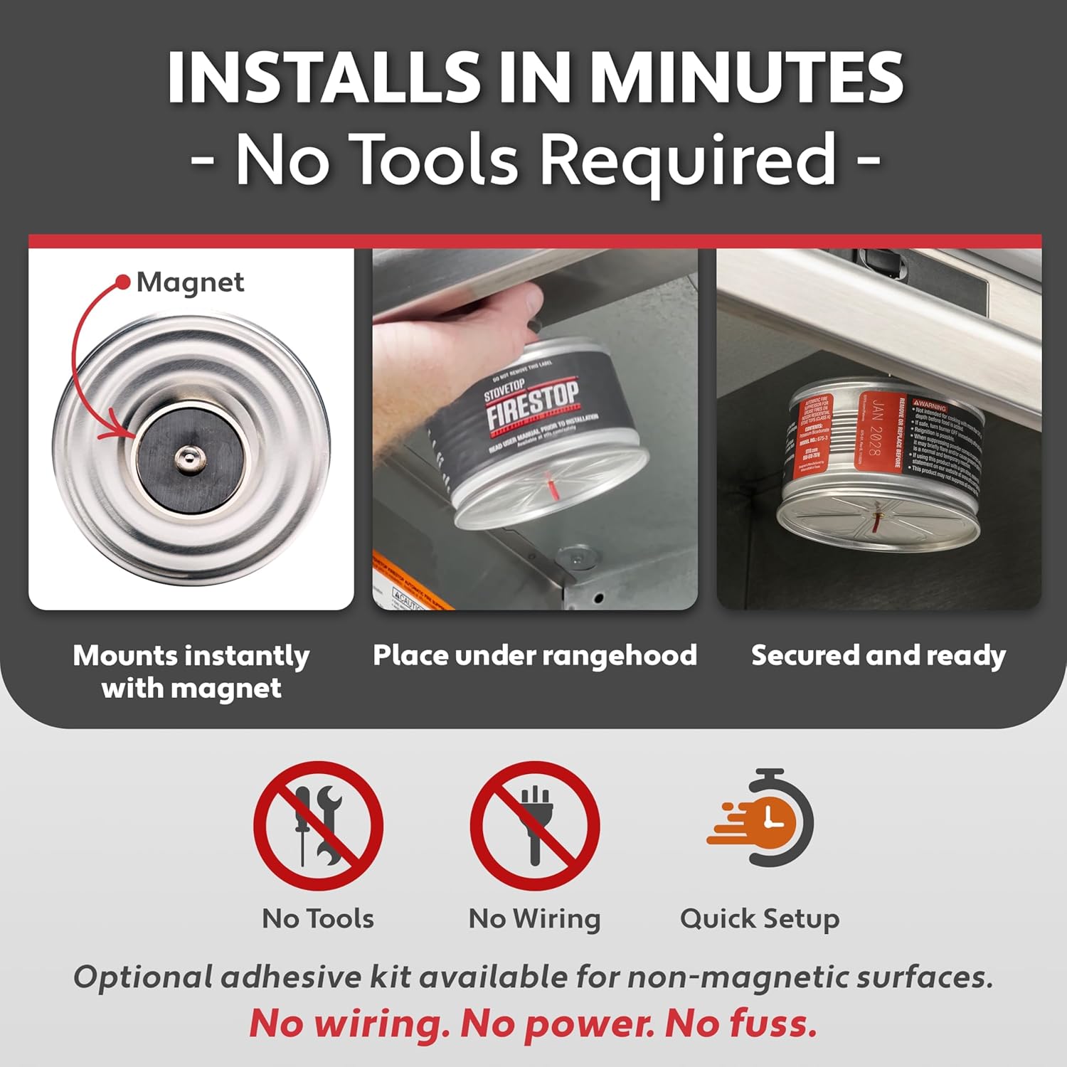 EASY TO INSTALL & AUTOMATICALLY ACTIVATED – Installs quickly under your range hood with included magnets. When exposed to direct sustained flame contact, it activates automatically, releasing a fire-suppressing agent for fast, effective protection.