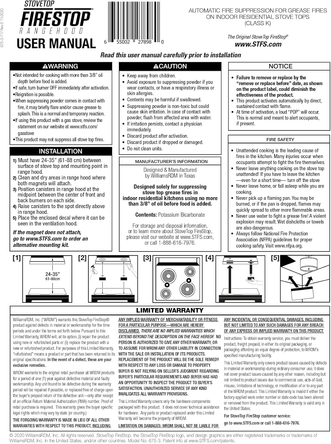 PROTECT YOUR PROPERTY AND LOVED ONES – Designed specifically for residential kitchens with four-burner stoves, the Rangehood Fire Suppressor offers essential protection against cooking fires. Tested and approved for grease fires, it automatically activates to quickly suppress flames caused by grease.