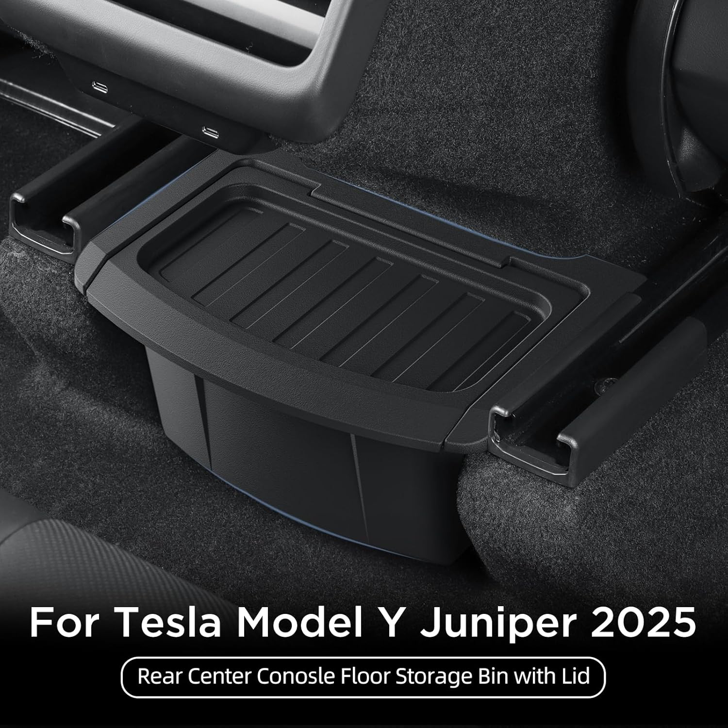 Rear Center Console Floor Storage Organizer Box for Tesla Model Y Juniper 2025 2026,Black TPE Car Accessory with Anti-Slip Lid,Backseat 2nd Row Seat Organizer Bin