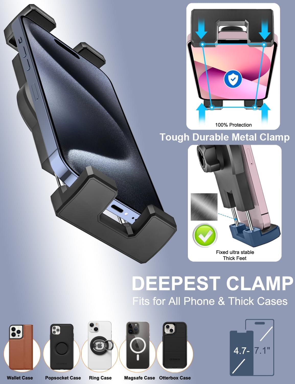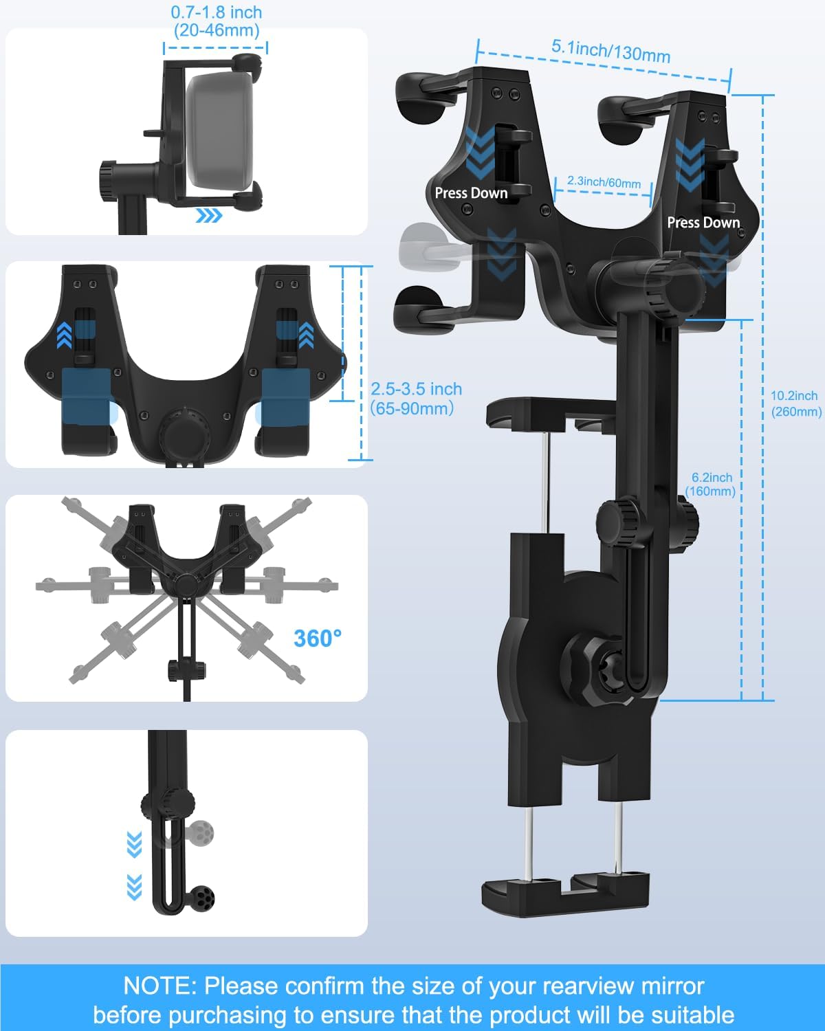 【Stable Four Points Fixation】Adjustable four points fixation design are suitable for various thicknesses of car rearview mirrors(thickness from 20mm to 46mm).The contact surface between the points and the rearview mirror has soft anti-skid and shock-absorbing sponge, which can keep your phone safe and stable even if you suddenly brake or drive on bumpy roads. In addition, these sponge pieces can also effectively protect the rearview mirror from scratches.