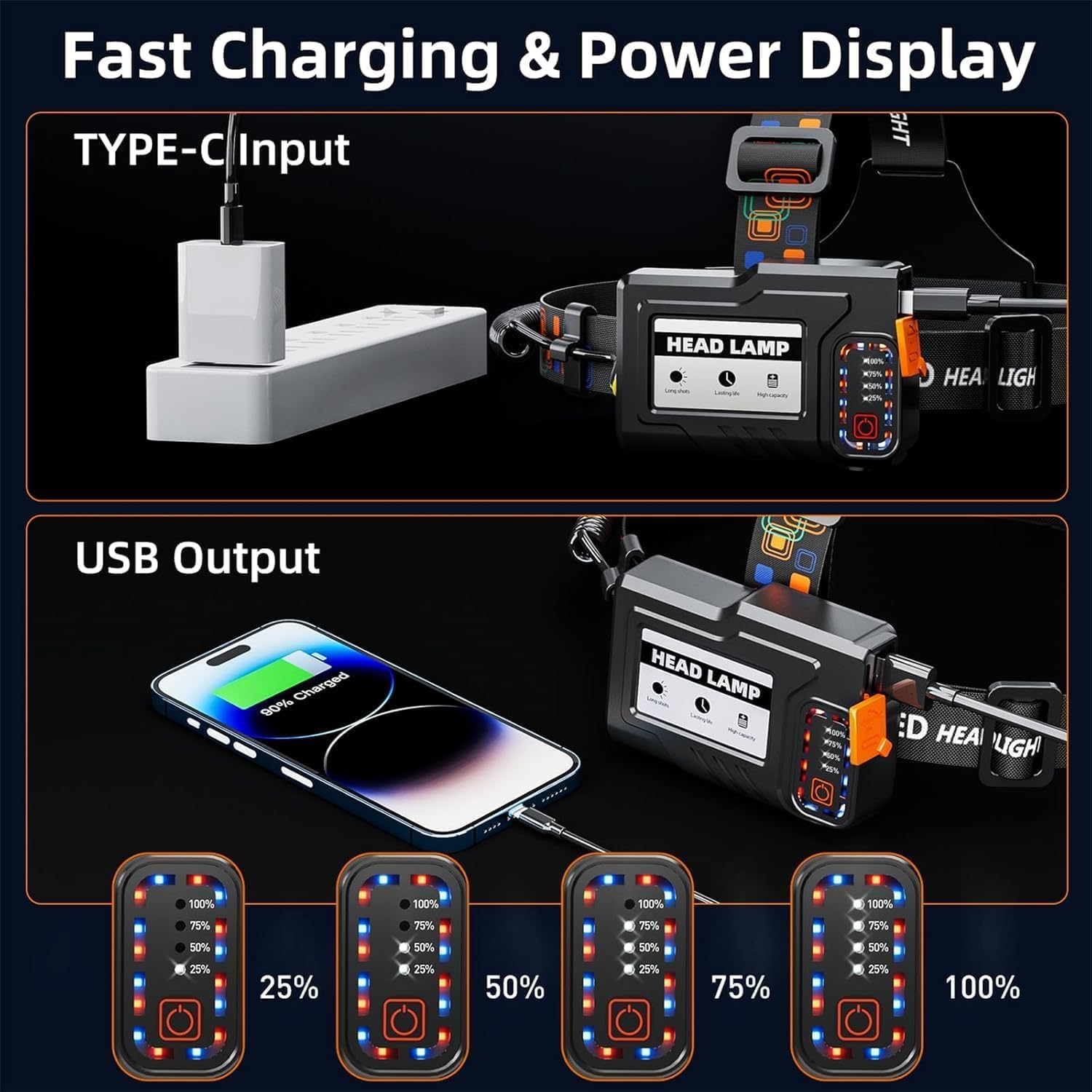 Package include:1 x Rechargeable LED Headlamps, 1 x User Manual, 1 x Charging Cable