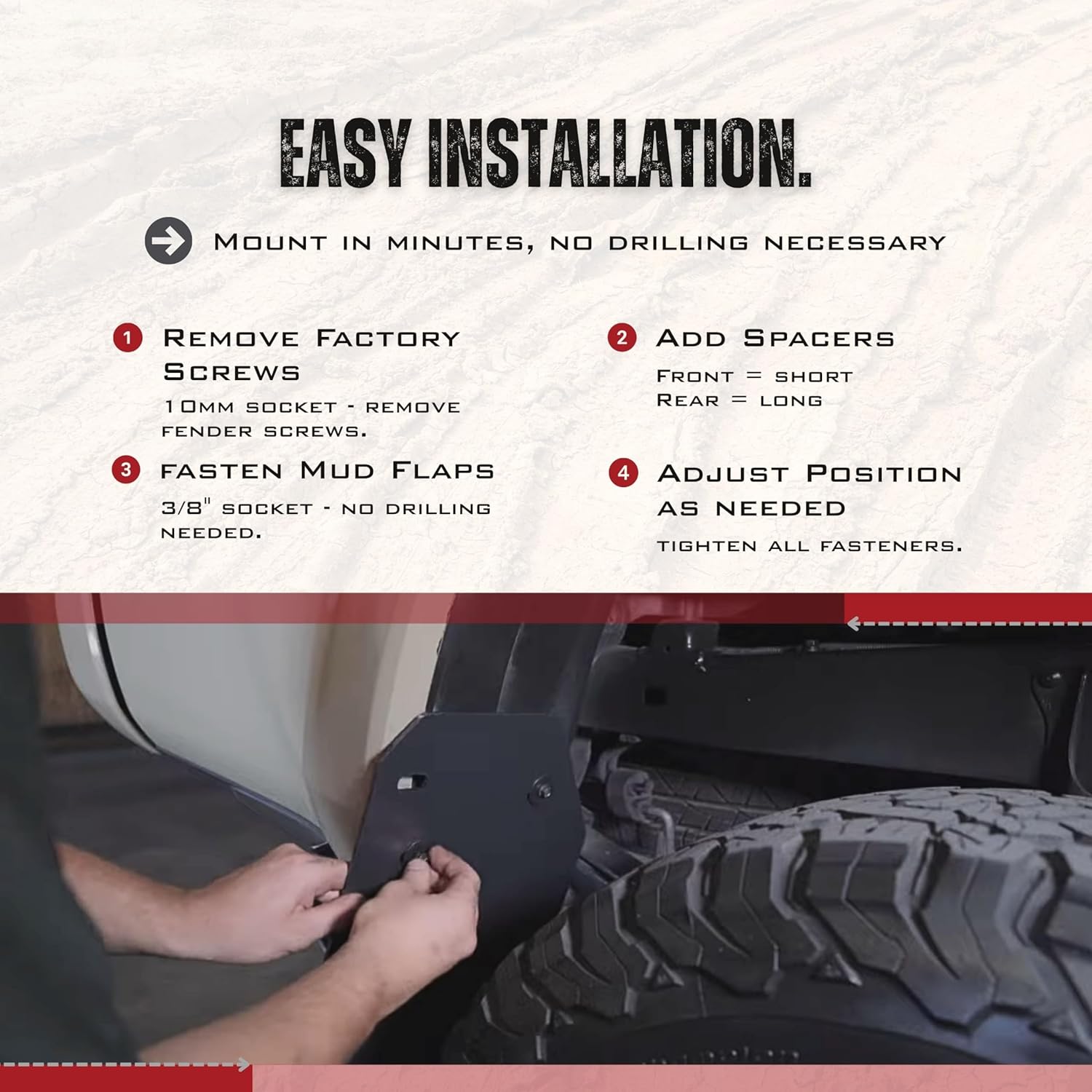 Took about 40mins to install front and rear flaps, instructions were very clear and concise. I used a 10mm to remove the stock fender screws, and 3/8 to install the RekGen hardware (as stipulated in the instructions). They adjusted easily, and I have them extending 1/4 past the tires/fender.Initially I was skeptical with the front and rear spacers being different in length, but installed them as they were labeled in the bag. The front spacers are shorter, and when screwed down the front flaps will be angled in a bit, which makes sense to allow for the tire to turn. The rear spacers were longer and the rear flap is level with the trim screws.They look good, seem sturdy enough for daily driving and light off roading, and were reasonably priced.