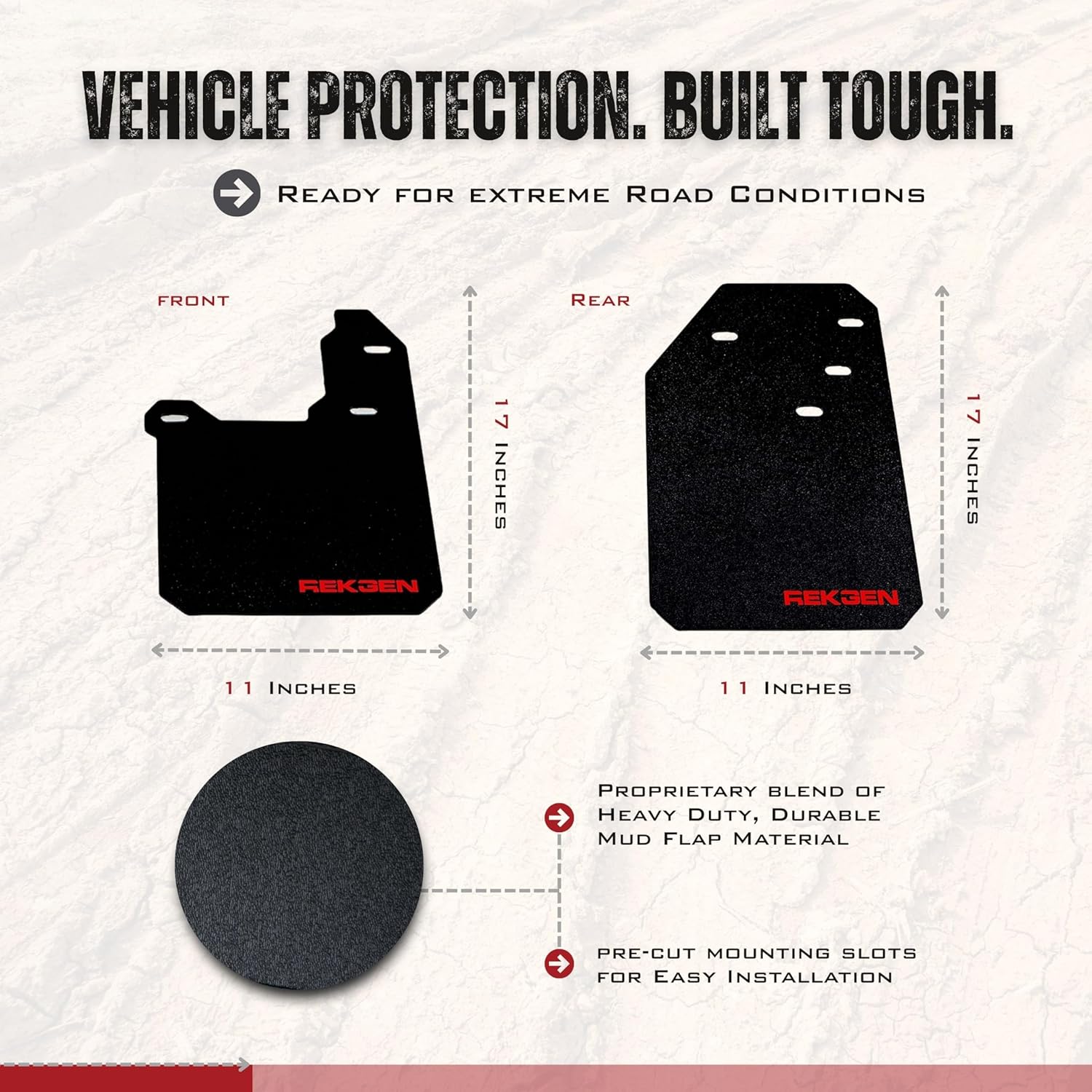 BUILT FOR TOUGH CONDITIONS: Crafted from heavy-duty materials that flex on impact, these truck mud flaps shield your paint and undercarriage from rocks, mud, and road debris on every off road or daily drive.