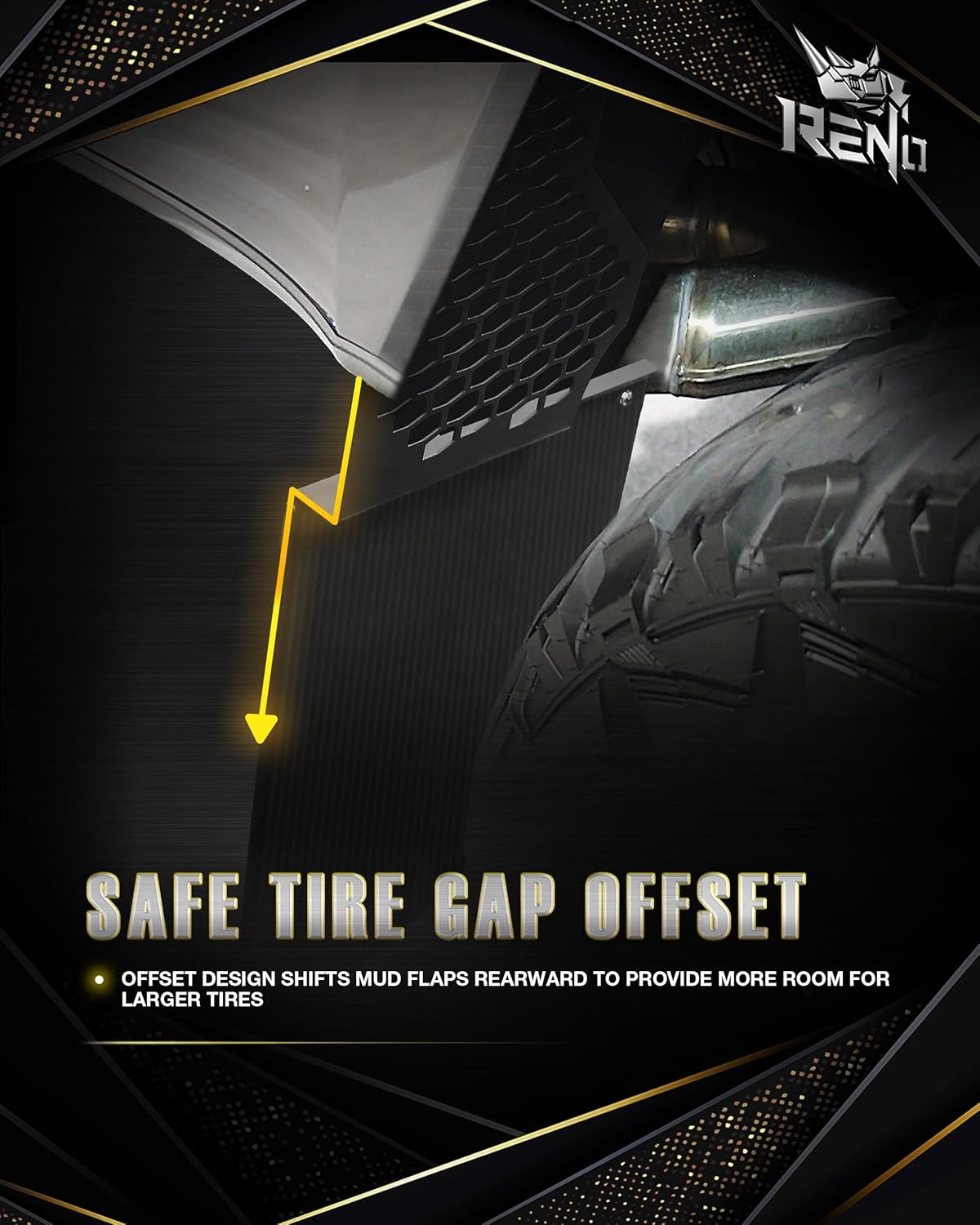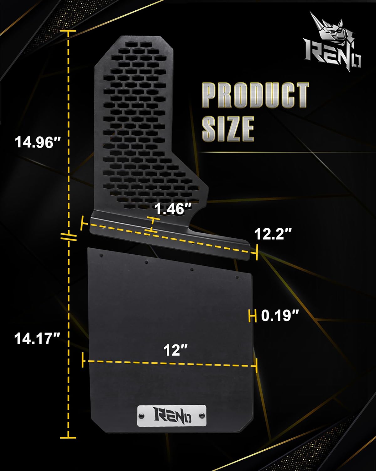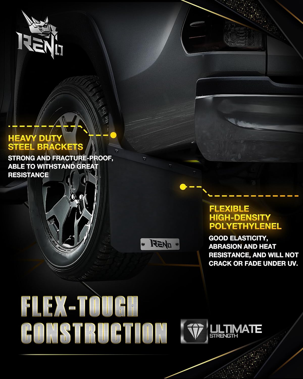 Ultra-Durable Flex-Tough Material:Crafted from high-density polyethylene (HDPE)+ Stainless steel mounting bracket, RENO mud flaps combine superior flexibility, UV resistance, and extreme durability. Engineered to resist cracking, fading, and warping—even in harsh weather conditions.