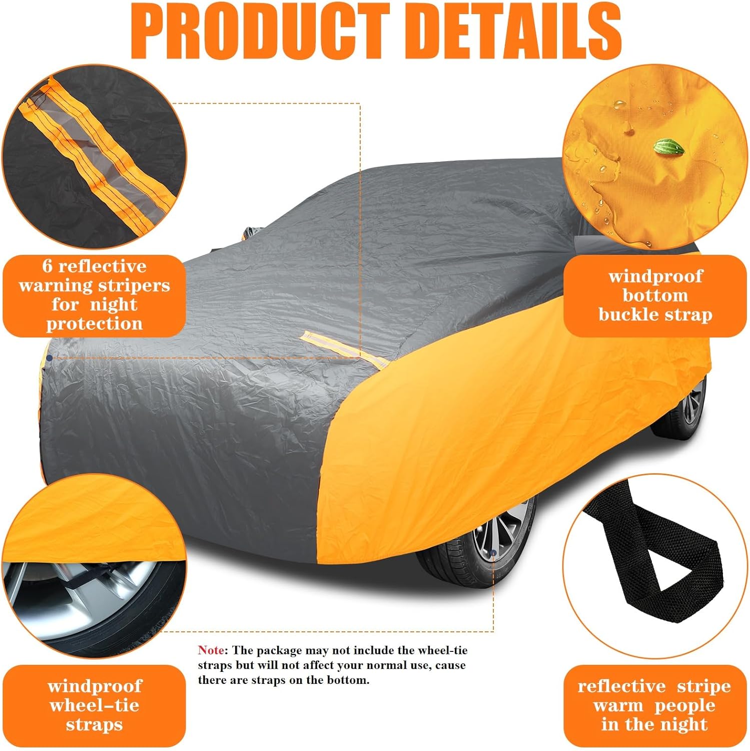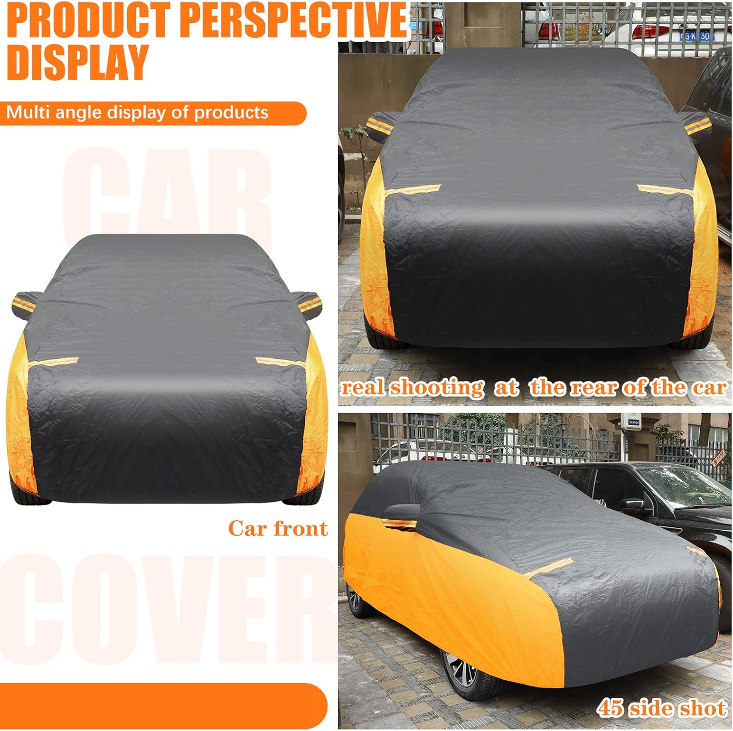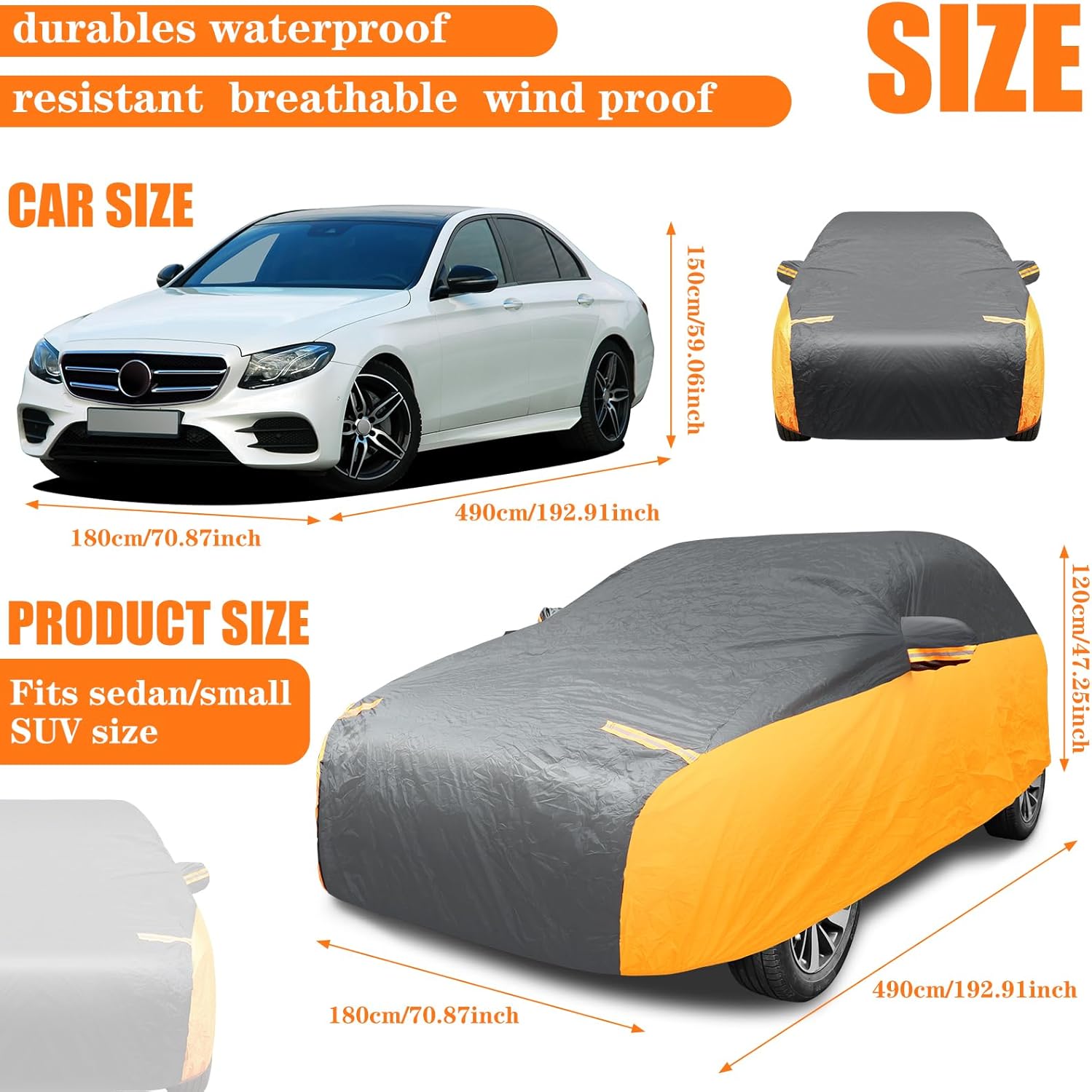 Size Information: in order to better meet your needs, carefully check the size of the car jacket and the corresponding size that fits the car before purchasing; The size of our orange and black spliced car jacket is suitable for your 192.91 x 70.87 x 59.06 inches model, usually cars and small suvs 185 to 193 inches; Note: the package may not include the wheel tie straps but will not affect your normal use, cause there are straps on the bottom