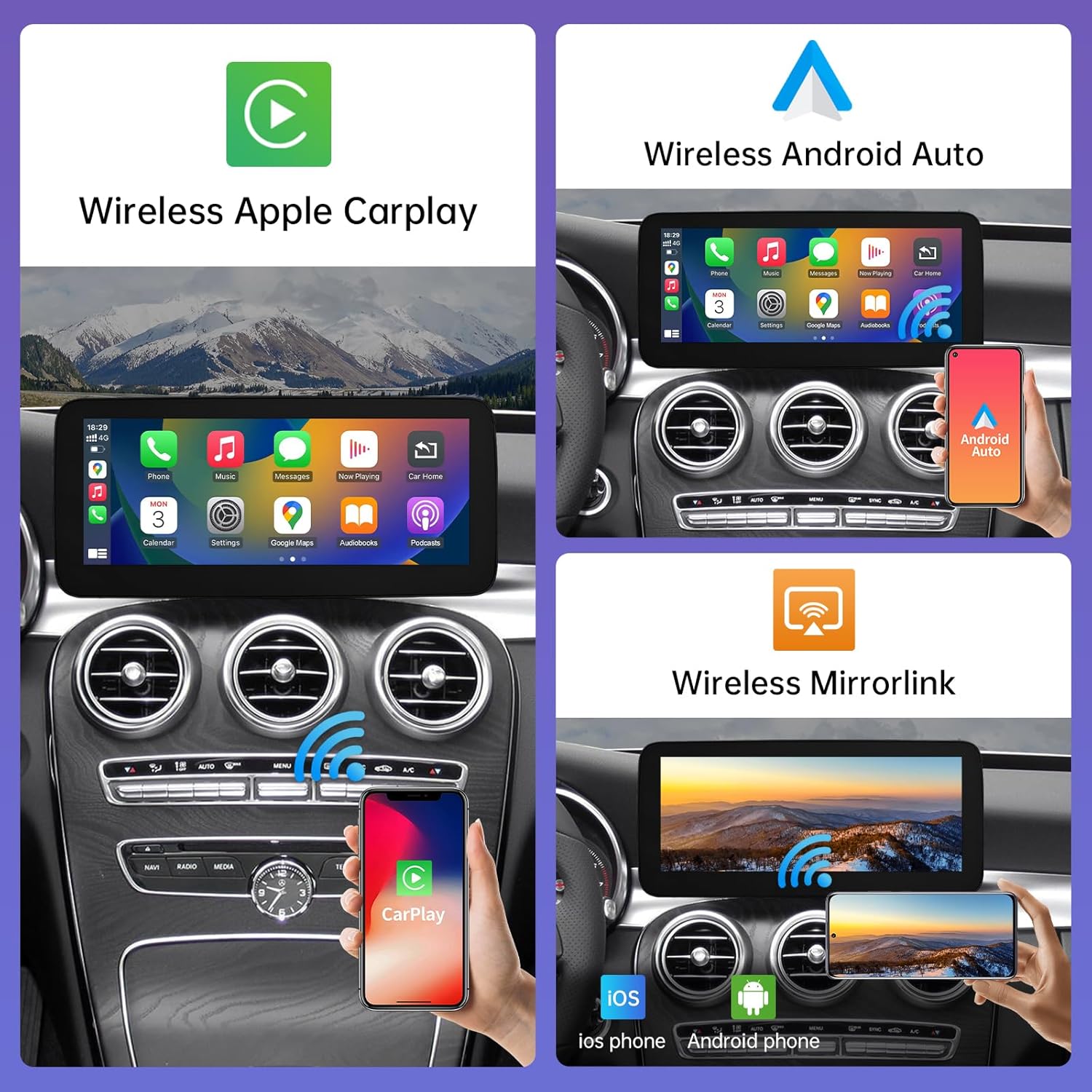 Wireless CarPlay & Android Auto for Mercedes:Upgrade your vehicle with wireless CarPlay and Android Auto for Mercedes-Benz, allowing access to navigation, music, calls, and messages. This touchscreen upgrade supports voice control via Siri and Google Assistant for safer driving.