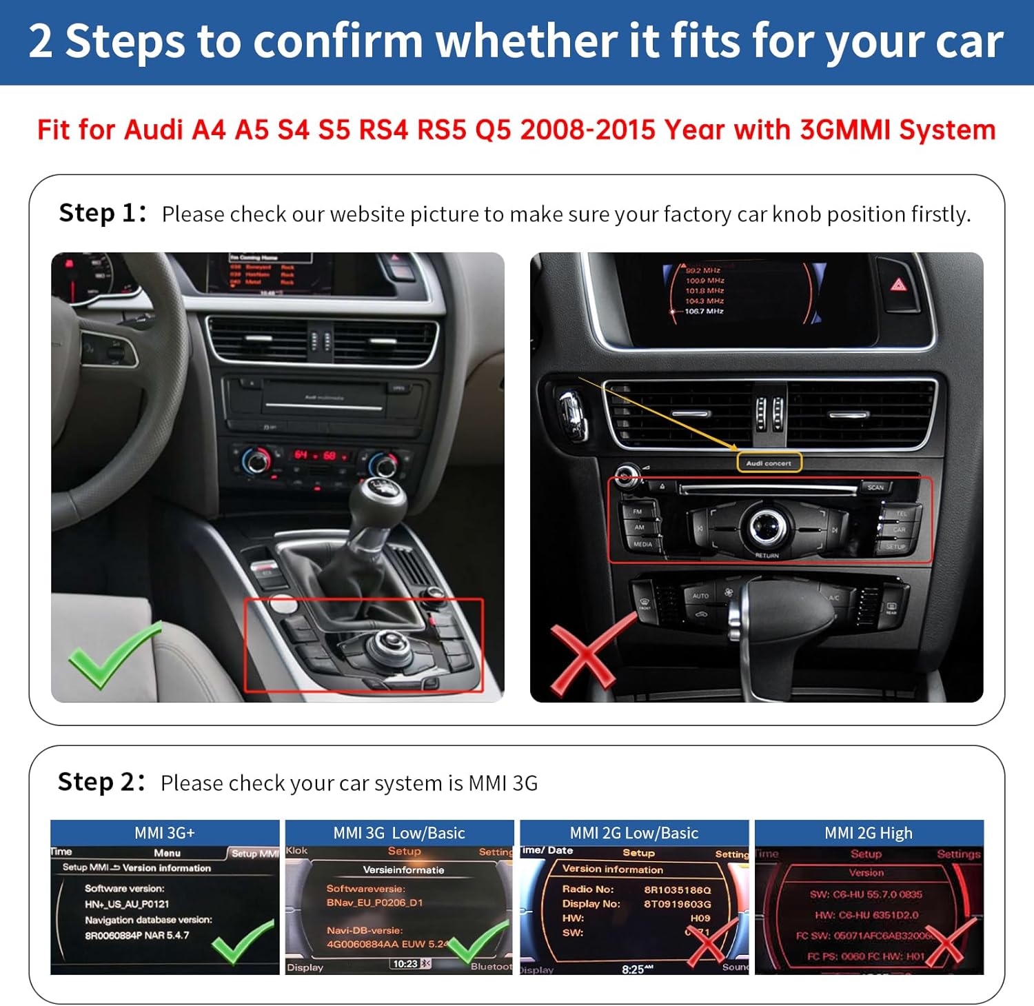1. Vehicle Compatibility – For Audi 3G MMI System: CarPlay interface box for Audi A4 A5 S4 S5 RS4 RS5 Q5 (2008–2015) with 3G MMI system, this CarPlay Android Auto retrofit kit upgrades your factory infotainment system without replacing the original screen. Not compatible with MMI 2G system, Concert, or Symphony radio systems.