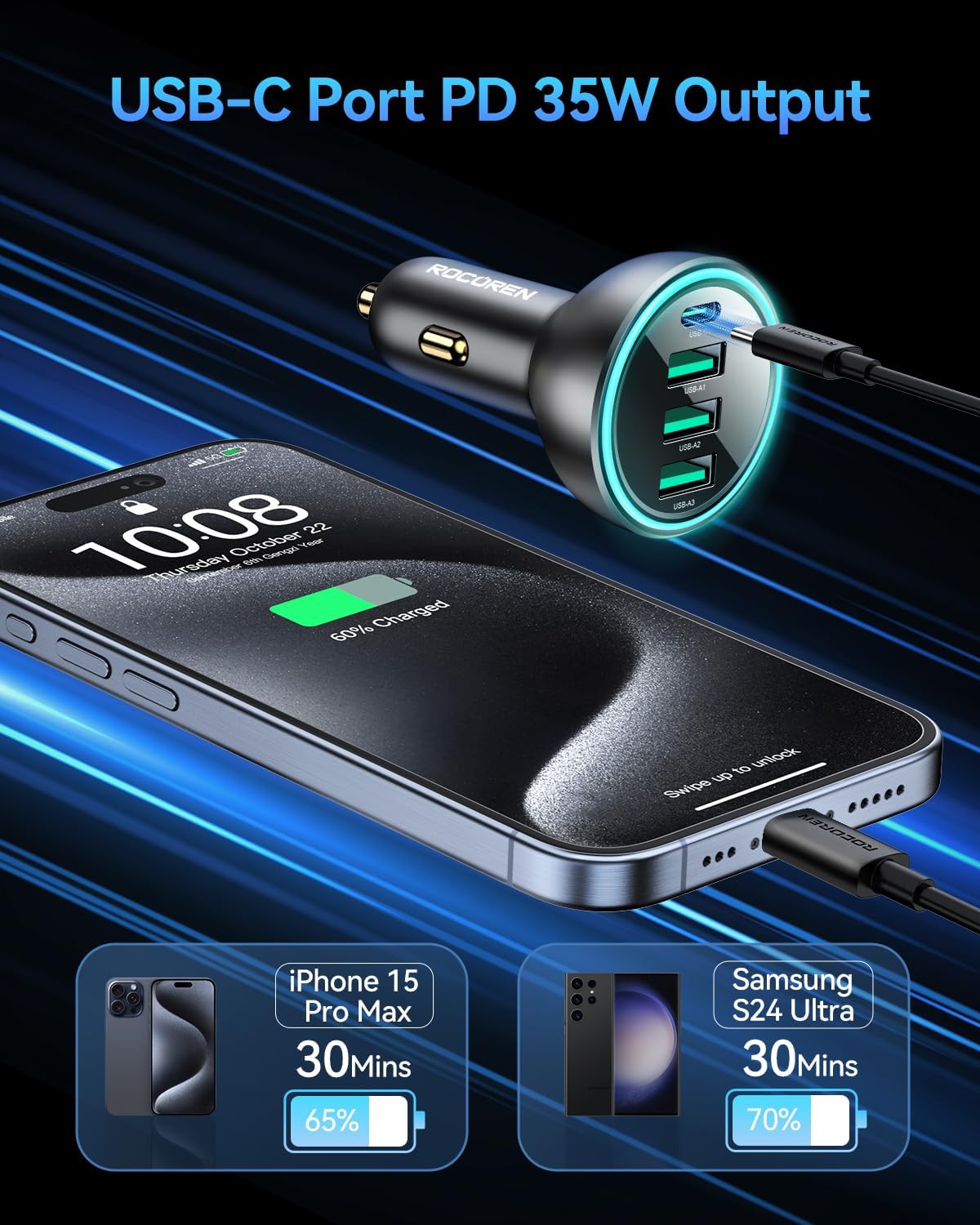 35W USB C & 15W USB A: The USB-C ports (PD3.0) can output 35W Max and the 3*USB-A ports (QC3.0) all can output 15W Max when used individually. The car usb charger can fast charge iPhone 16 Pro Max to 65% and Samsung S25 Ultra to 70% in just 30 mins