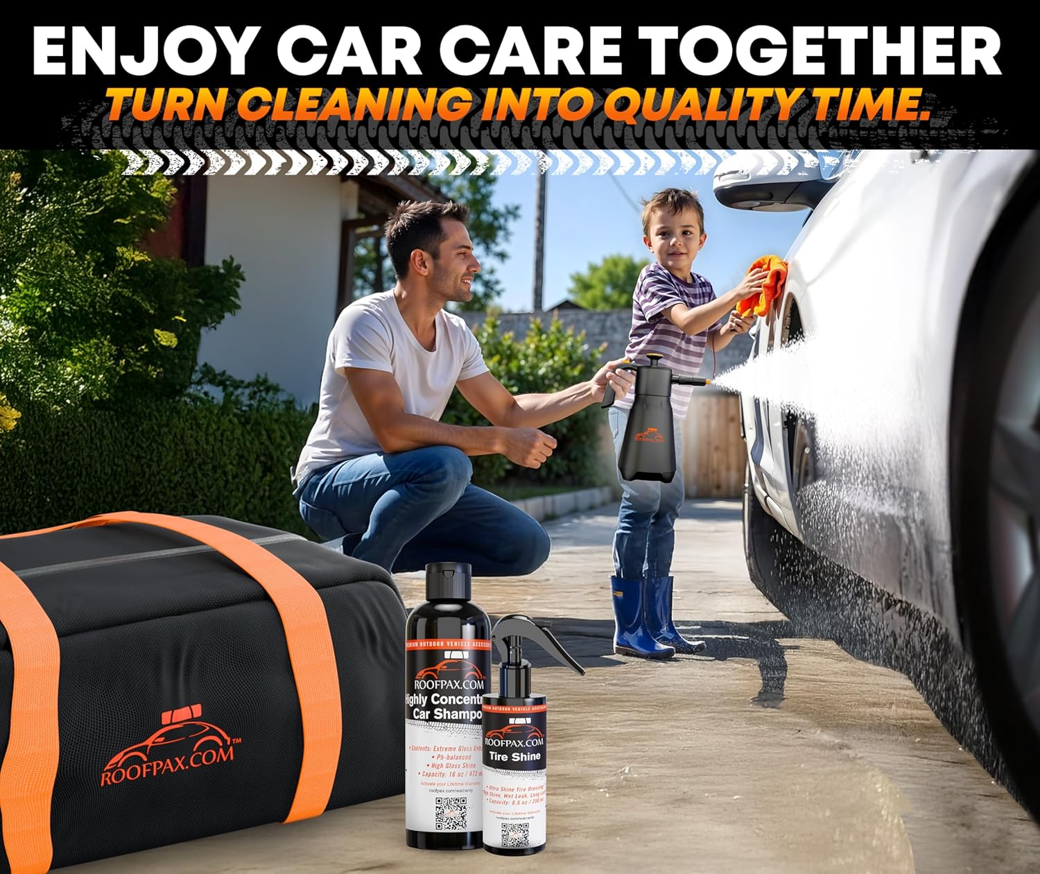 RoofPax Eco-Friendly Waterless Car Wash Spray Kit with Pressure Foam Microfiber Cloths Gel Cleaner Magic Sponge Tire Brush & Tire Spray Rinseless Car Wash for Exterior & Interior Cleaning