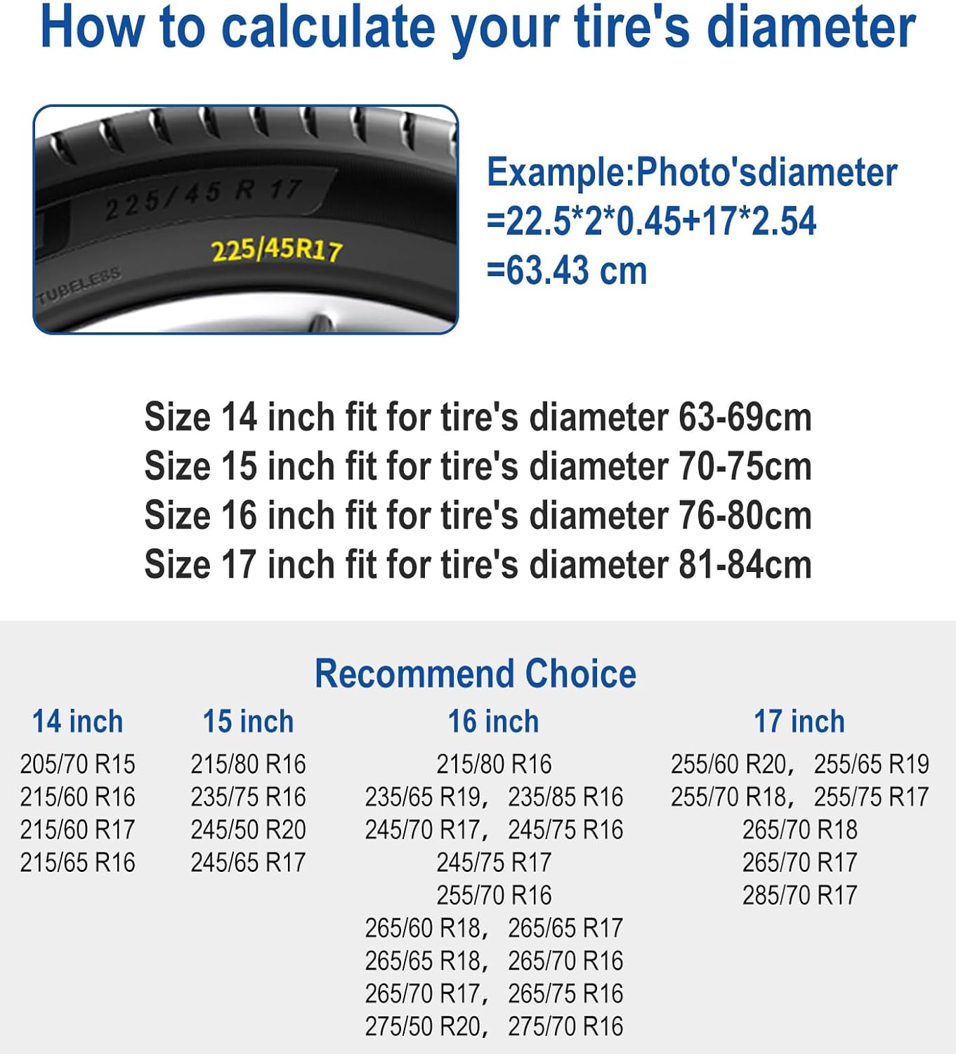 Spare tire covers come in a variety of sizes to fit different car models to meet your needs. Please measure the size of your tires before you buy, for details, please refer to the size chart we provide. Any questions, please feel free to contact us.