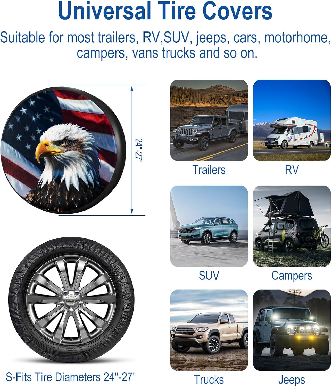 Wide application, the jeep tire cover flag adopts the classic and popular usa flag with eagle pattern, The design adds a patriotic touch to your vehicle, reflecting your love for the USA. Overall, it’s a solid investment if you’re seeking durability and protection for your spare tire while also enhancing your vehicle’s choose simple atmosphere and beautiful , And it is suitable for most car models such as RV, truck, SUV, Wrangler, trailer, etc.