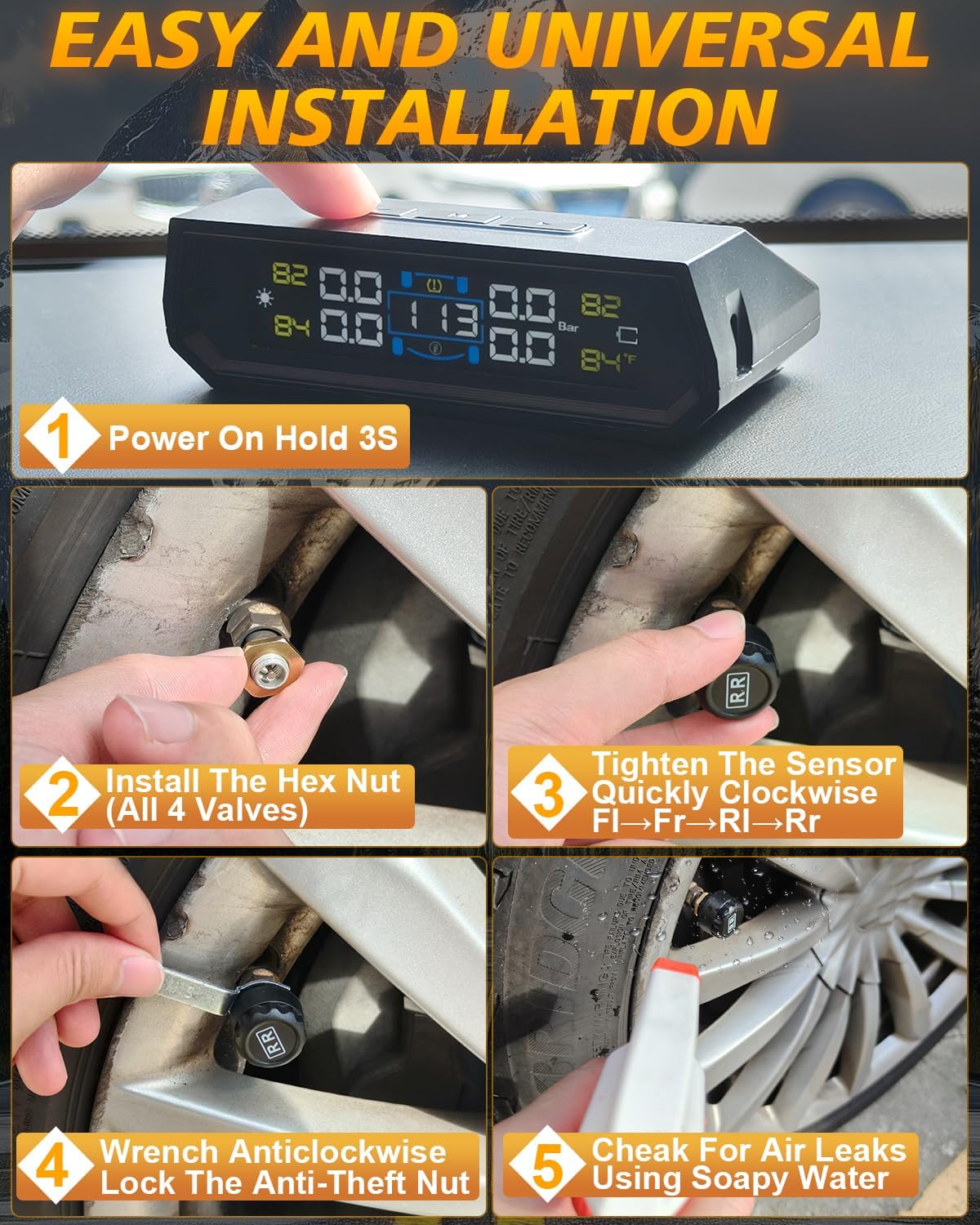 6 SMART ALARMS CUSTOM THRESHOLDS: NSDXCT tire pressure monitoring system features 4 sensors LF/RF/LR/RR 6 distinct alarm modes, including high/low pressure, high temperature, sensor disconnection, low battery, rapid leak and sensor fault. The tire monitoring system will automatically configures the current pressure as reference point when tire sensors installed, no need manual set the high and low pressure alert value ,smart and convenient. Effortless setup for alarm thresholds, supports instant unit switching between PSI/BAR and °F/°C.