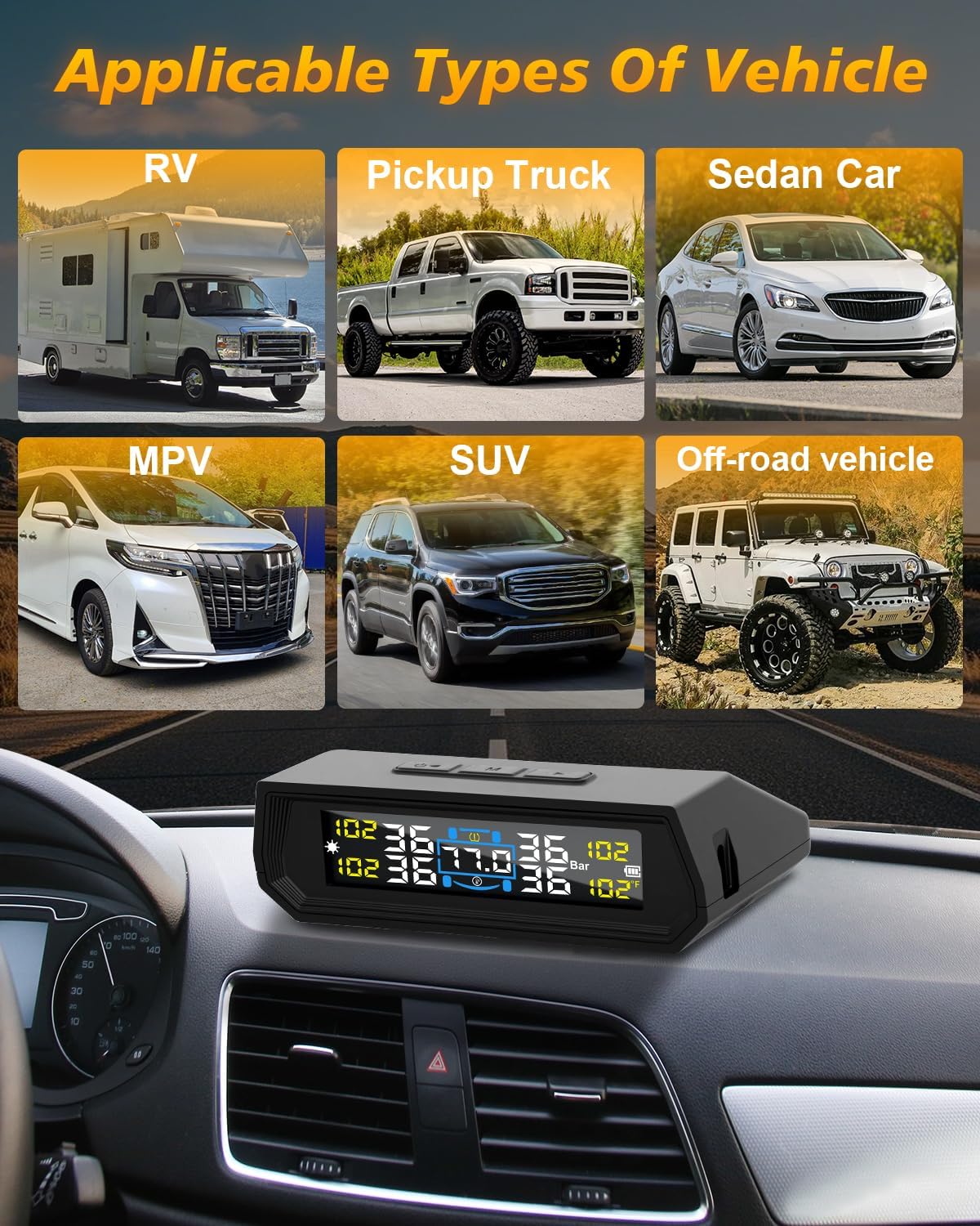 SOLAR AND USB CHARGING: Enjoy the Unlimited Power of dual power supplies. TPMS tire pressure monitor system is equipped with an efficient solar panel that can automatically charge in sunlight or ambient light, ensuring it does not run out of power during the day. For night or cloudy days, simply charge it using the included USB cable. Trailer tire pressure monitoring system intelligent wake-up and sleep, when the car starts, the display automatically turns on; When the car is turned off, the monitor automatically shuts down.