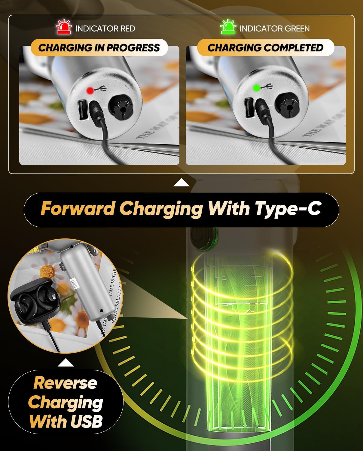 【Two Different Charging Interfaces】The Saker car vacuum portable cordless is equipped with a built-in 3 * 2600mAH battery, which is rechargeable and reusable, making it more environmentally friendly and energy-efficient. The 6-in-1 car vacuum cleaner has two different charging ports. One uses a Type-C data cable to charge the vacuum cleaner, and the green indicator light can promptly remind you that the battery is fully charged. A USB charging cable that can be plugged in to connect the other end to a device that needs to be charged, such as a phone, tablet, etc.