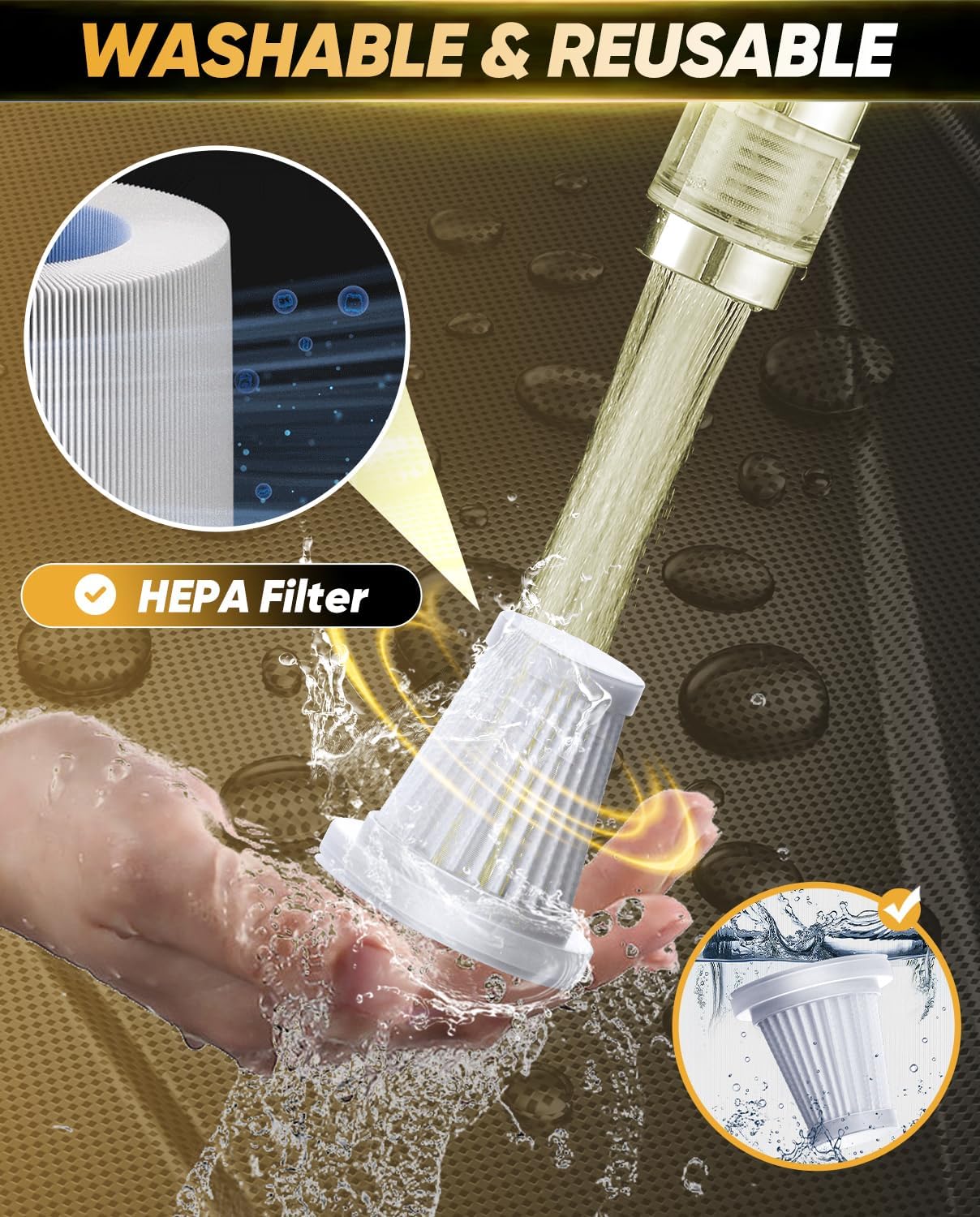 【HEPA Filter】Saker rechargeable handheld vacuum cleaner is equipped with 2 HEPA filters, which can be used for replacement. HEPA filters can be used for 2-3 months and can be cleaned or cleaned with brushes included in the accessories.