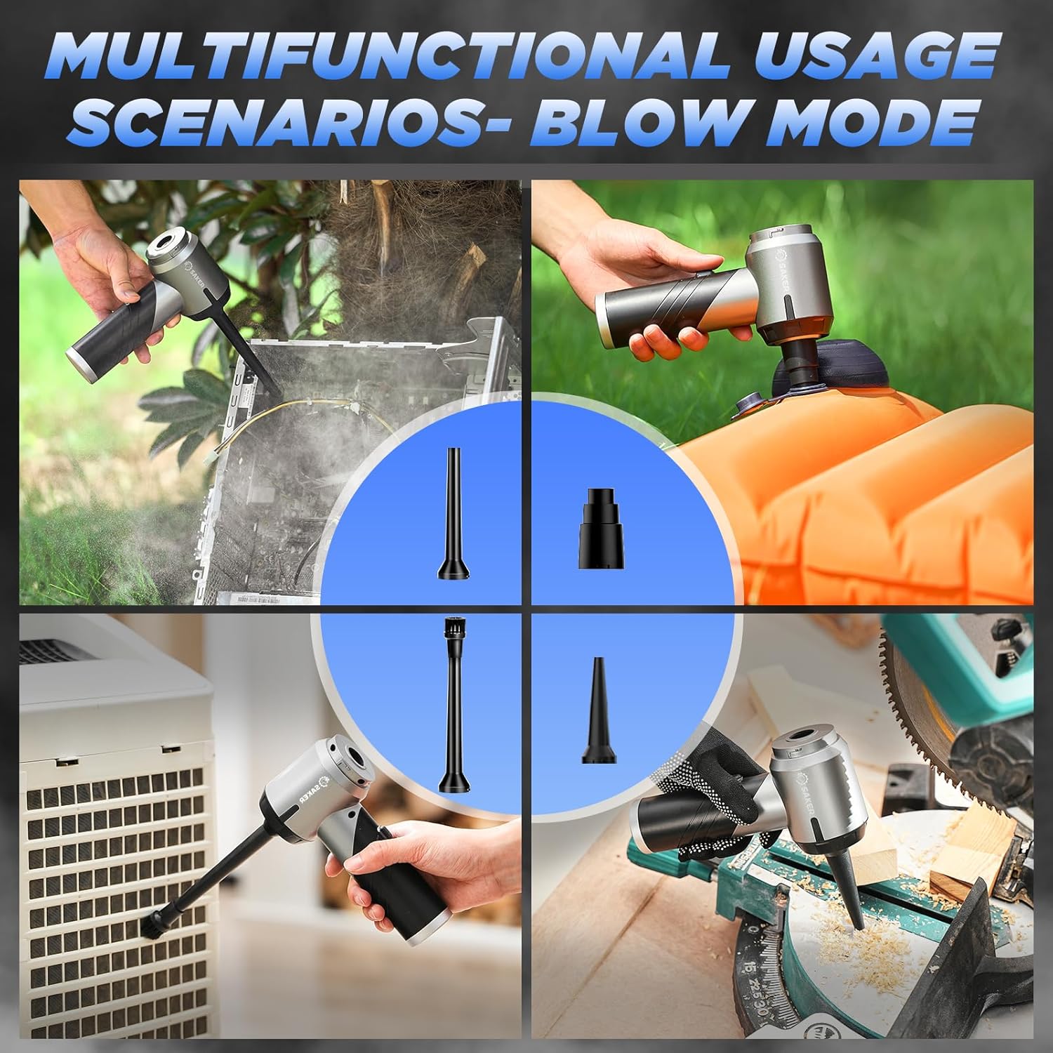 【3-in-1 Multifunctional Mini Car Vacuum Cleaner】Saker portable car vacuum is equipped with a variety of accessories to meet various usage scenarios such as blowing, sucking and pumping. It can not only clean computer keyboards, host computers, windows and other difficult-to-clean gaps, but also sofas, seats, cars, woodworking workshops, offices, etc, to meet your various cleaning needs.