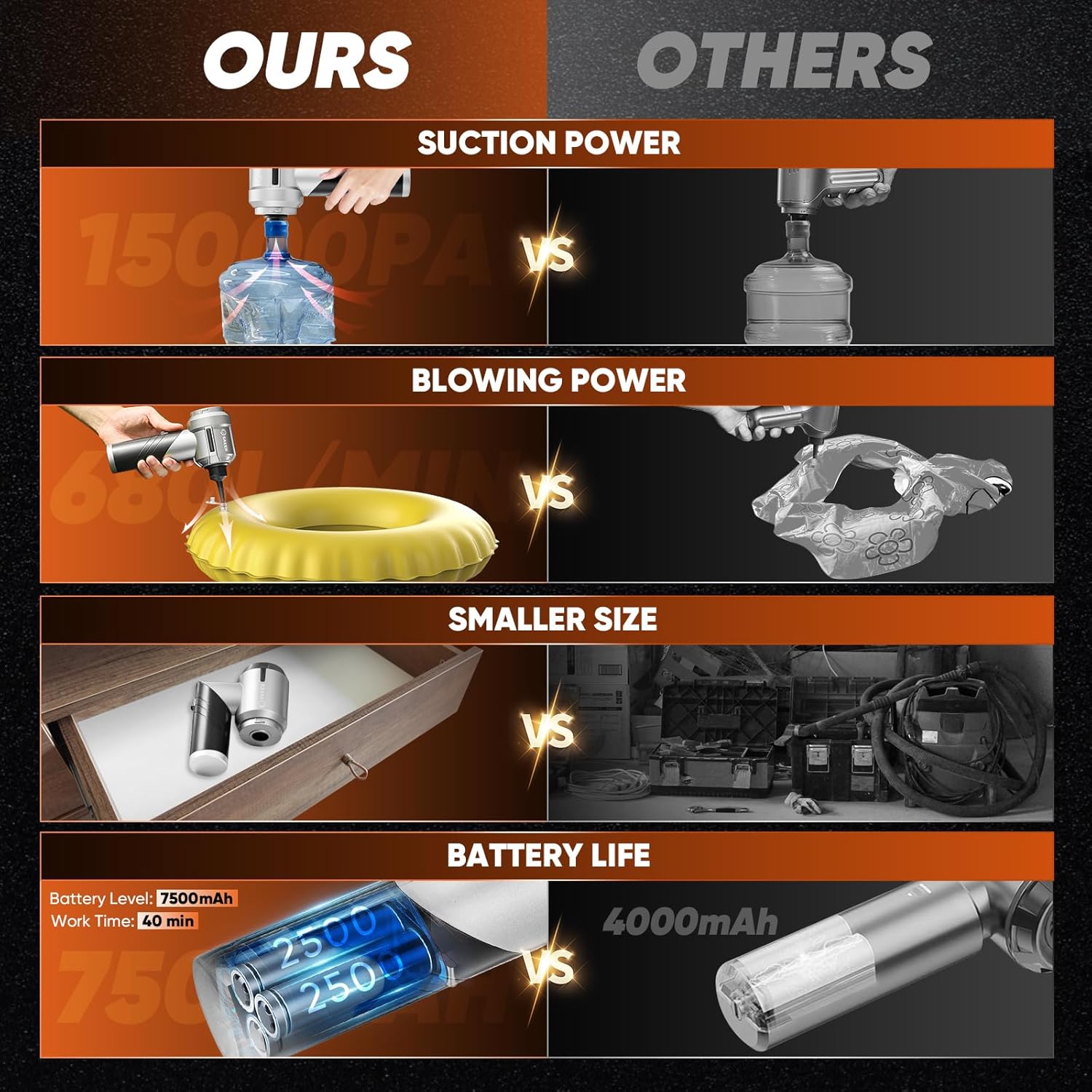 【Practical accessories】The included accessories can easily clean hard-to-reach corners, and the sleeve with a brush can easily remove stubborn dust in the gaps. With the blowing accessory set, you can quickly inflate the swimming ring and kayak, and you can also help with combustion in outdoor barbecues, help carpenters blow away sawdust, and vacuum storage bags. Rich accessories can make your life more convenient.