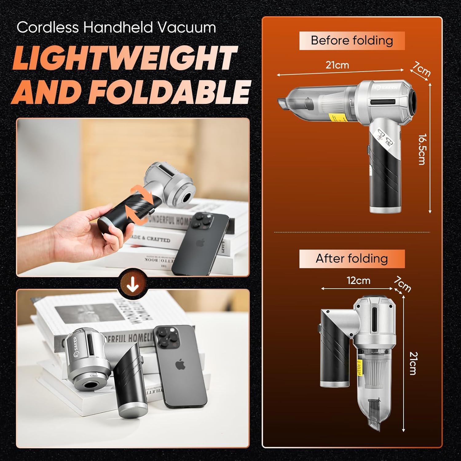 【Lightweight and Portable】Saker fold-able vacuum cleaner is compact, only 380g, wireless use is not limited by space, and it can be rotated and folded. After folding, it is only as big as the palm, which can be more convenient to carry and store.