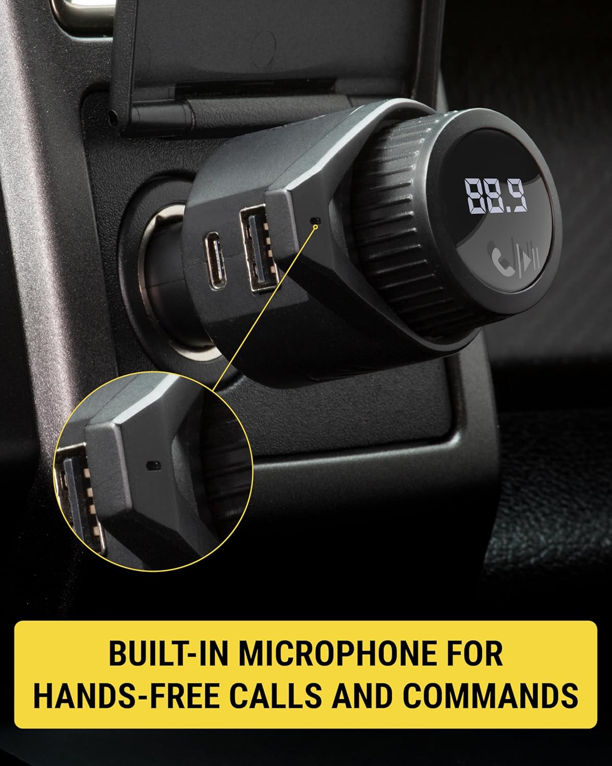 12V Cigarette Lighter Adapter – Plugs directly into your car’s 12V cigarette lighter socket for unlimited transmitting and listening hours. This FM Bluetooth Transmitter car adapter doubles as a cigarette lighter charger and features dual USB-A and USB-C 12W charging ports, allowing you to charge multiple devices on the go.