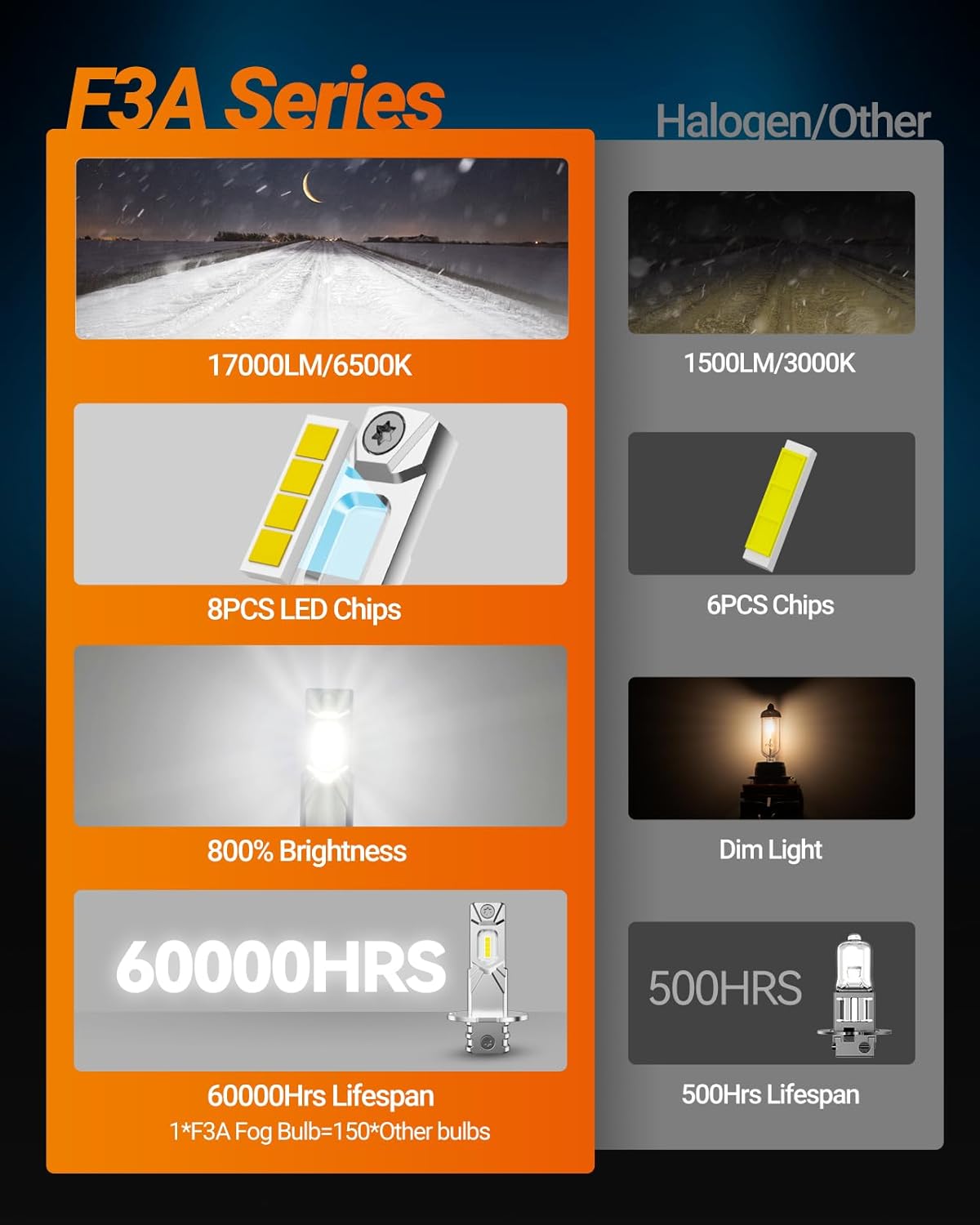 60,000 HRS Lifespan: Whether you’re commuting daily or driving mountain roads at night, the heat-efficient all-in-one aluminum body and dual-copper heat substrate technology keep your H3 fog light bulb running brighter for longer. The durable construction withstands rough terrain, ensuring stable, reliable fog-light performance year-round