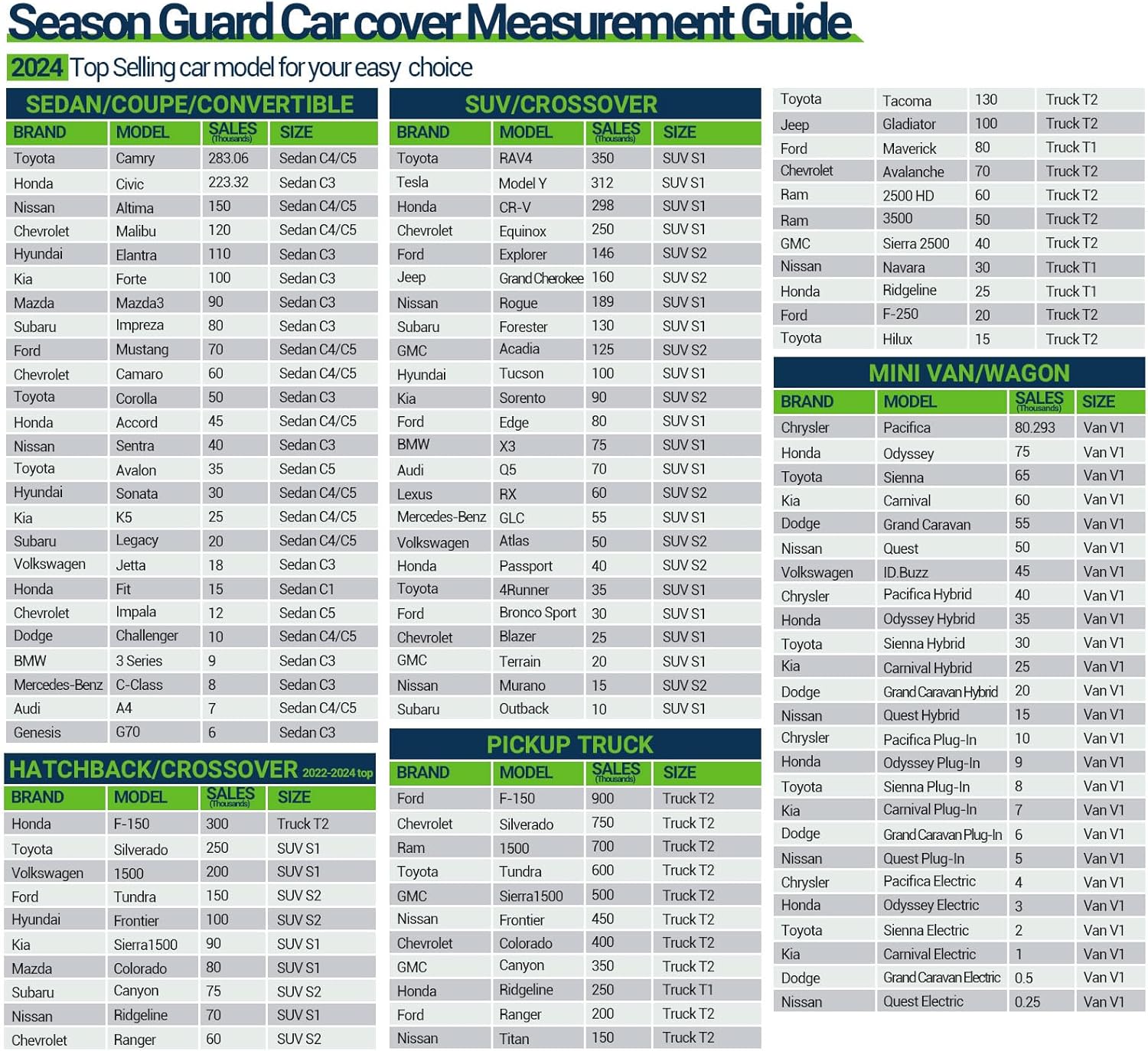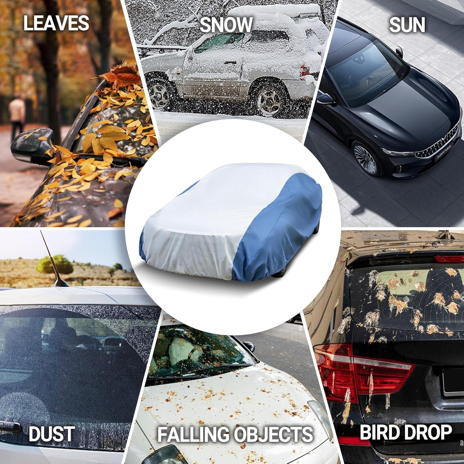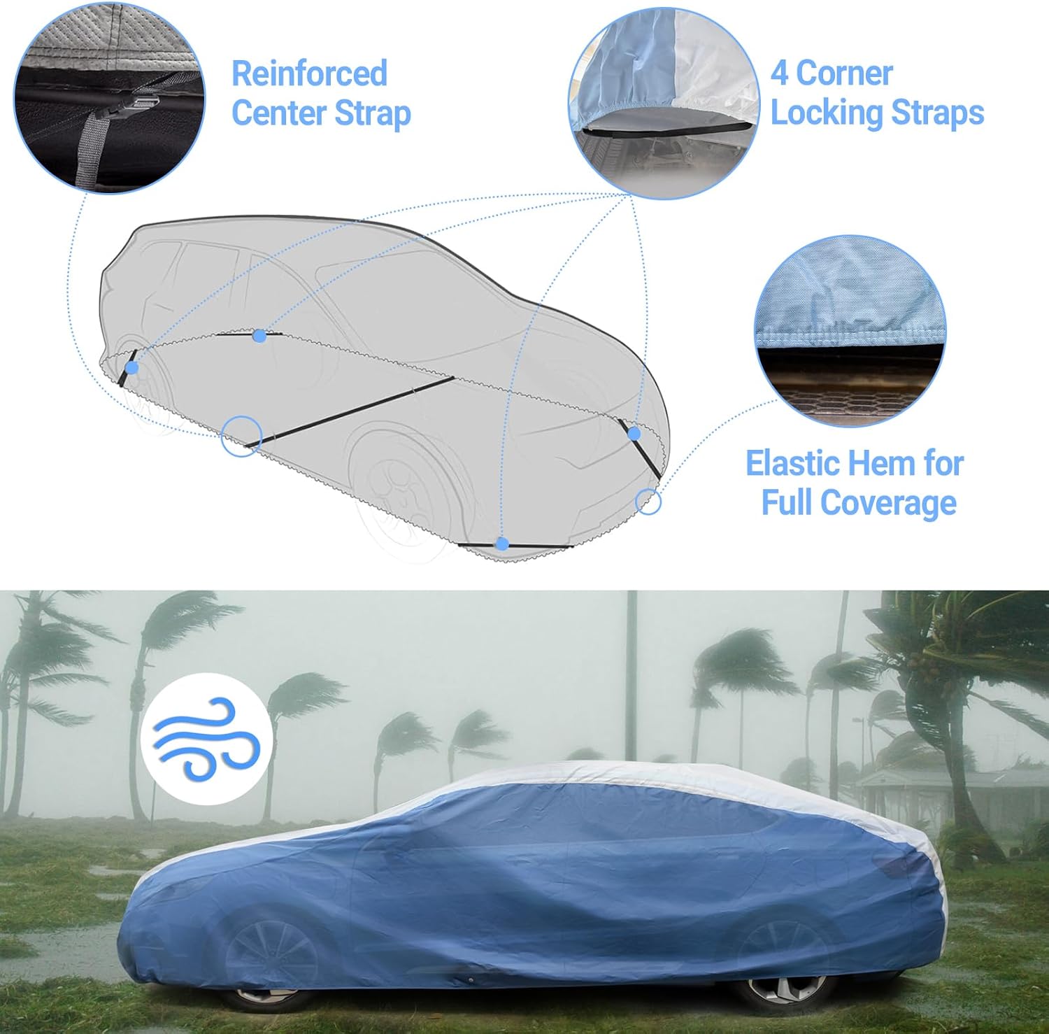 Dual-Zone HYVEK Protection: Season Guard’s exclusive HYVEK fabric combines a waterproof white PE center panel and breathable blue side panels, engineered for full-size cars. SGS-tested and UV-resistant, it protects your vehicle from rain, snow, dust, and sun damage, while allowing moisture to escape to prevent rust or paint degradation.