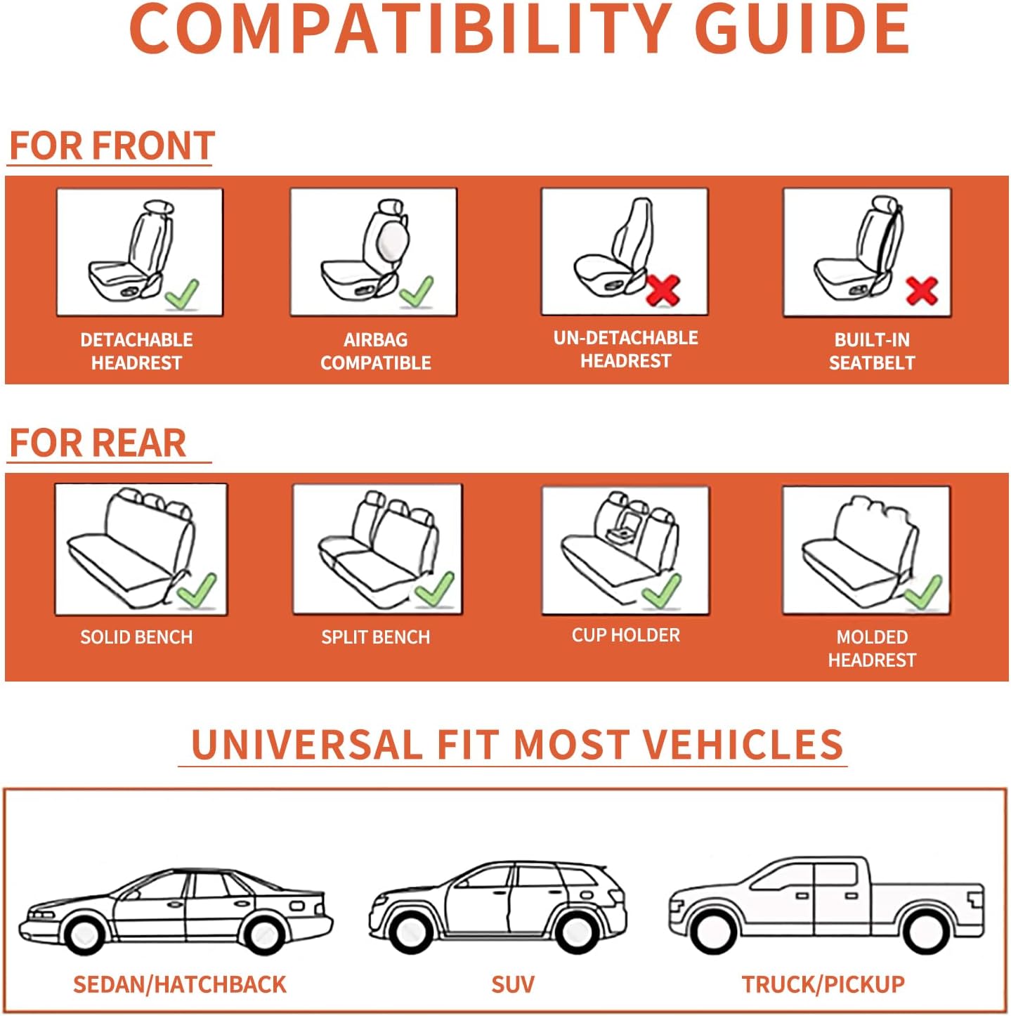 ✨UNIVERSAL FIT – Car seat covers full set. Each pack comes with 2 front seat covers and 3 back seat covers, which are compatible with most Cars, SUV, Truck and Pick-up. Enter your model on the product page to check if it fits. Tips: Please measure the size of your seat before buying to avoid incompatibility.