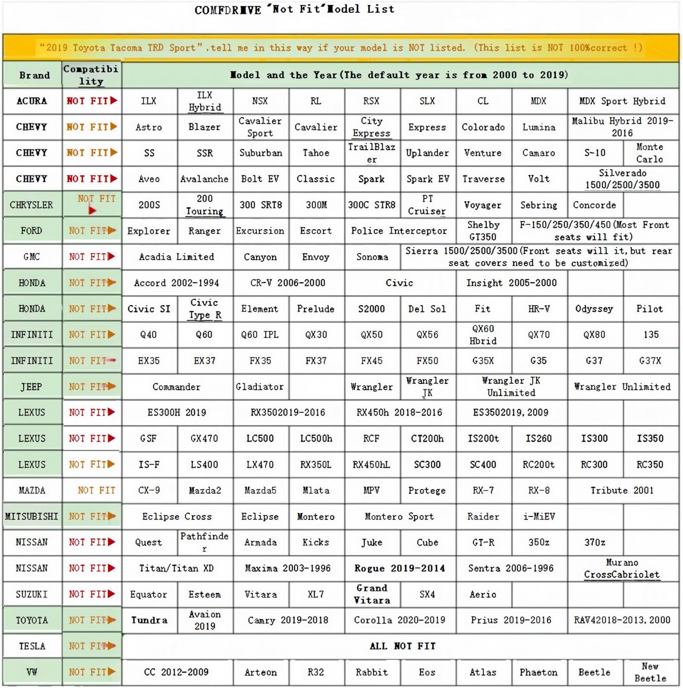 Fit Nissan: Sentra, X-Trail, Altima, Maxima, Frontier, Pathfinder / Fit Porsche: Macan / Fit Toyota: Corolla, RAV4, Camry, Highlander, Avalon, Prius, Yaris / Fit INFINITI: EX35, EX37, FX35, FX45, FX50, M37, M45, M56, I35, I30, Q70, QX30, QX50, Q50 / NOTE: THESE SEAT COVERS DON’T FIT ANY TESLA MODELS