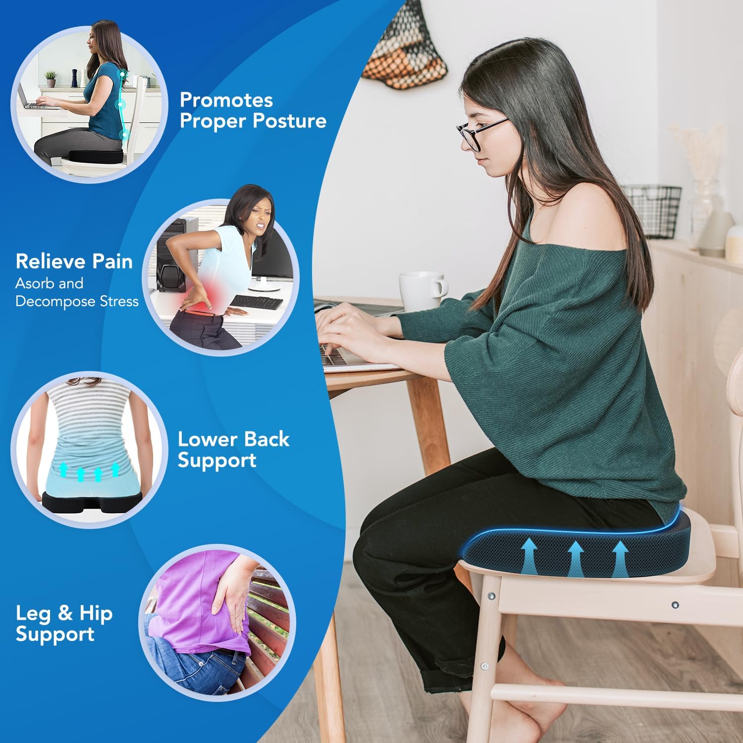 𝐂𝐎𝐂𝐂𝐘𝐗 𝐒𝐄𝐀𝐓 𝐂𝐔𝐒𝐇𝐈𝐎𝐍: Our tailbone pain relief cushion has a U-shaped ergonomic design by alleviating pressure on the coccyx/tailbone and relieving Sciatic Nerve Pain or Sciatica, Low Back, Lumbar, Tailbone, Prostate, Hip, Spine, Leg Pain, Backaches, Hemorrhoids, and post surgery or pregnancy pain relief. This sciatica pillow for sitting curved design minimizes pressure by cradling your bottom and providing evenly distributed support. Best back support pillow and tailbone cushion.