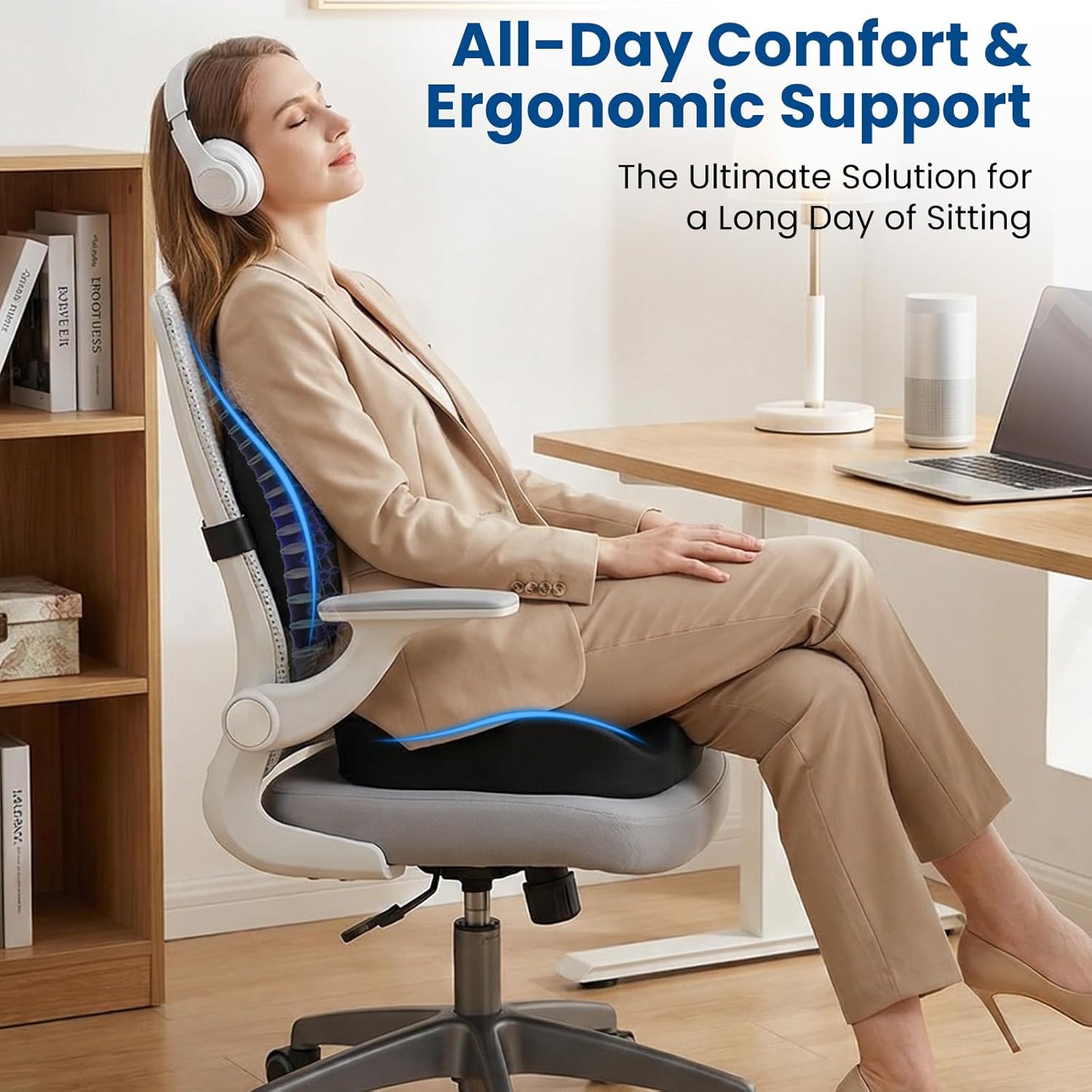 【Ergonomic Orthopedic Design】The ergonomic chair cushions specially designed to relieve pressure on your coccyx and promote a healthy sitting posture. Recommended by orthopedic experts, this seat cushions for office chairs helps reduce discomfort from sciatica, herniated discs, lower back strain, and tailbone injuries, making it ideal for daily use at home, in the car, or at the office.