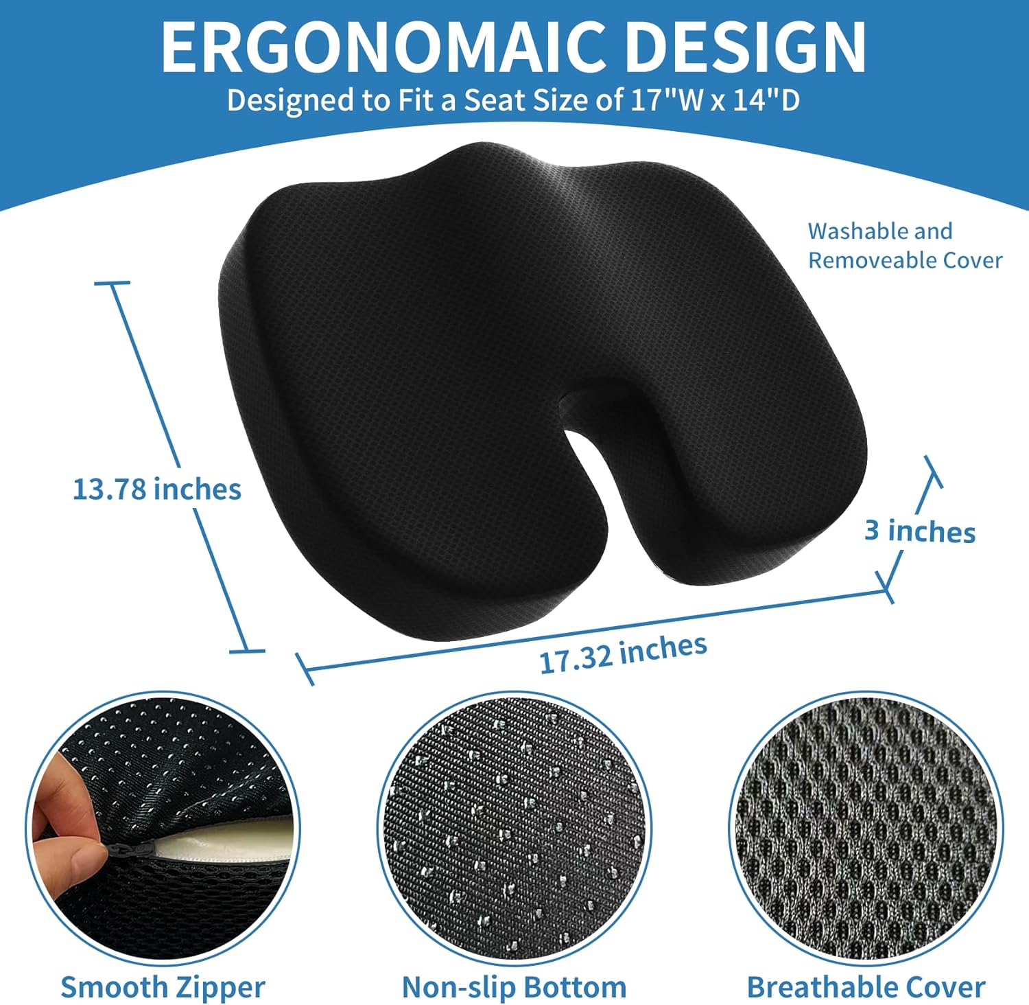 🖤【Tailbone Pain Relief】Lumbar pillow with ergonomic curve in line,chair cushion ergonomic U-shaped design, a perfect fit for the curve of the hip which can provide adequate support for the legs and hips, effectively reducing sciatica, tailbone, back pain, leg numbness, and hip pain.In addition,this thick chair cushion also helps to improve posture and relieve sedentary fatigue.Enjoy it as an office chair cushion or as a car pillow.