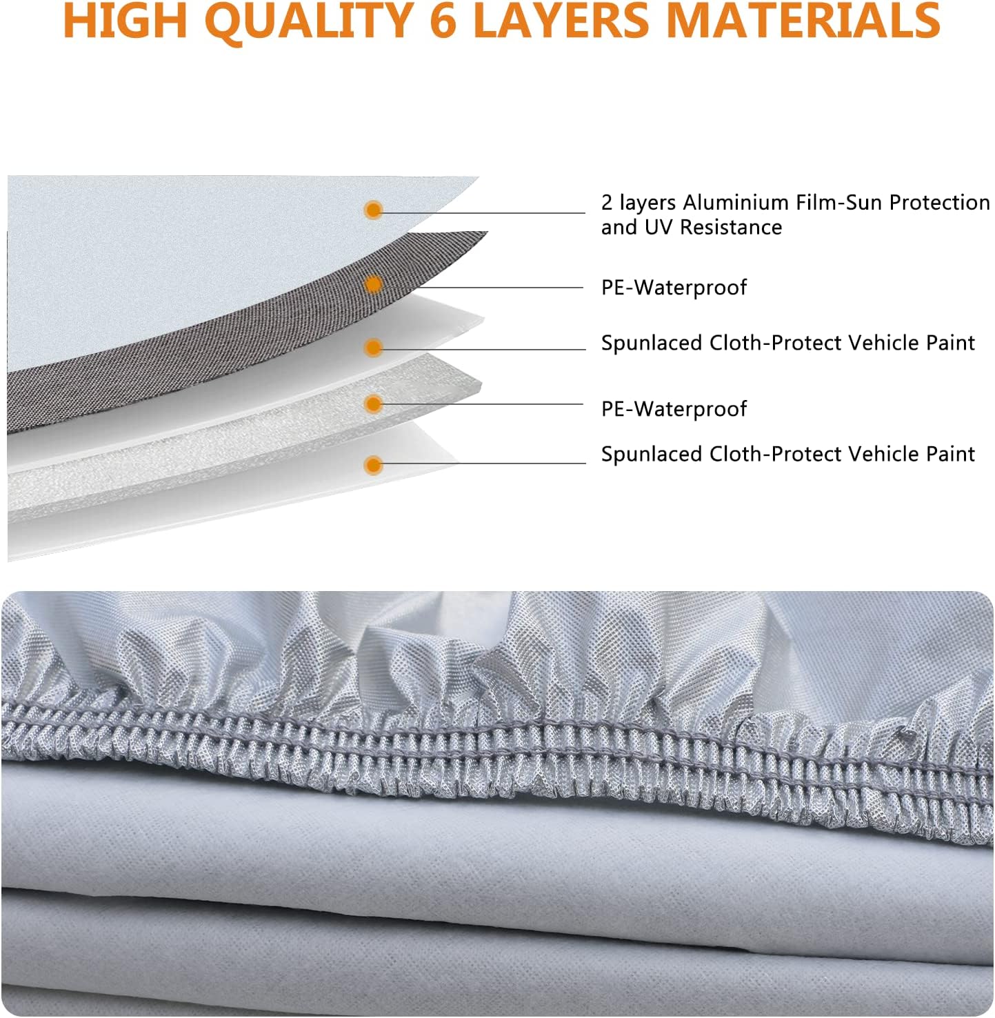 【6 Layers Durable Material】SEAZEN full exterior cover made of 6 layers fabric: 2 layers Aluminium & 2 layers PE & 2 layers Spunlaced Cloth. High reflective aluminum is good at sunproof and anti-uv, the reflectivity can reach more than 90%, the temperature difference between inside and outside the car can reach up to 40℉, keep the car cool in the summer; PE is 100% Waterproof, it’s great for rainproof snowproofing; Spunlaced cloth is thicker and soft, can protect your vehicle paint better.