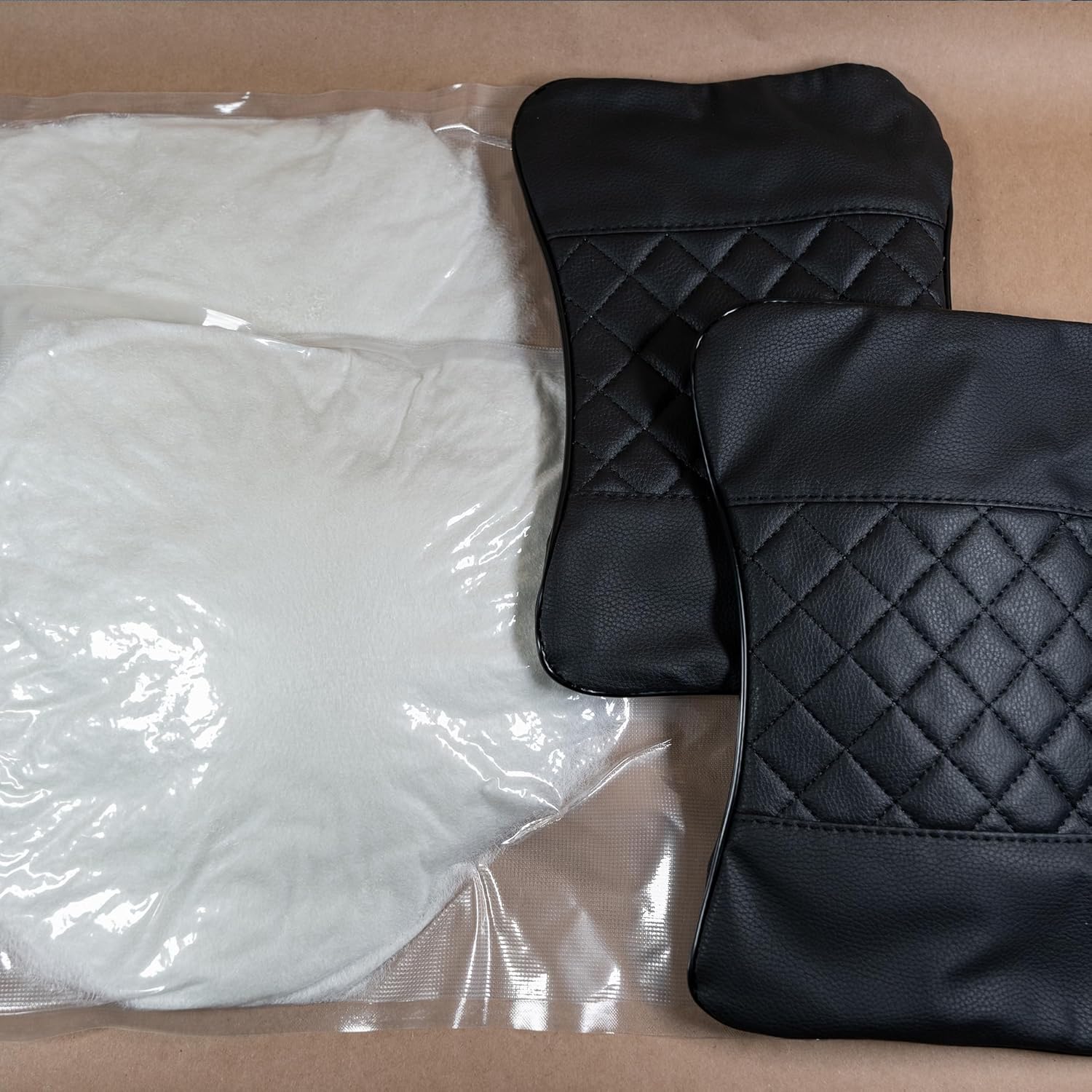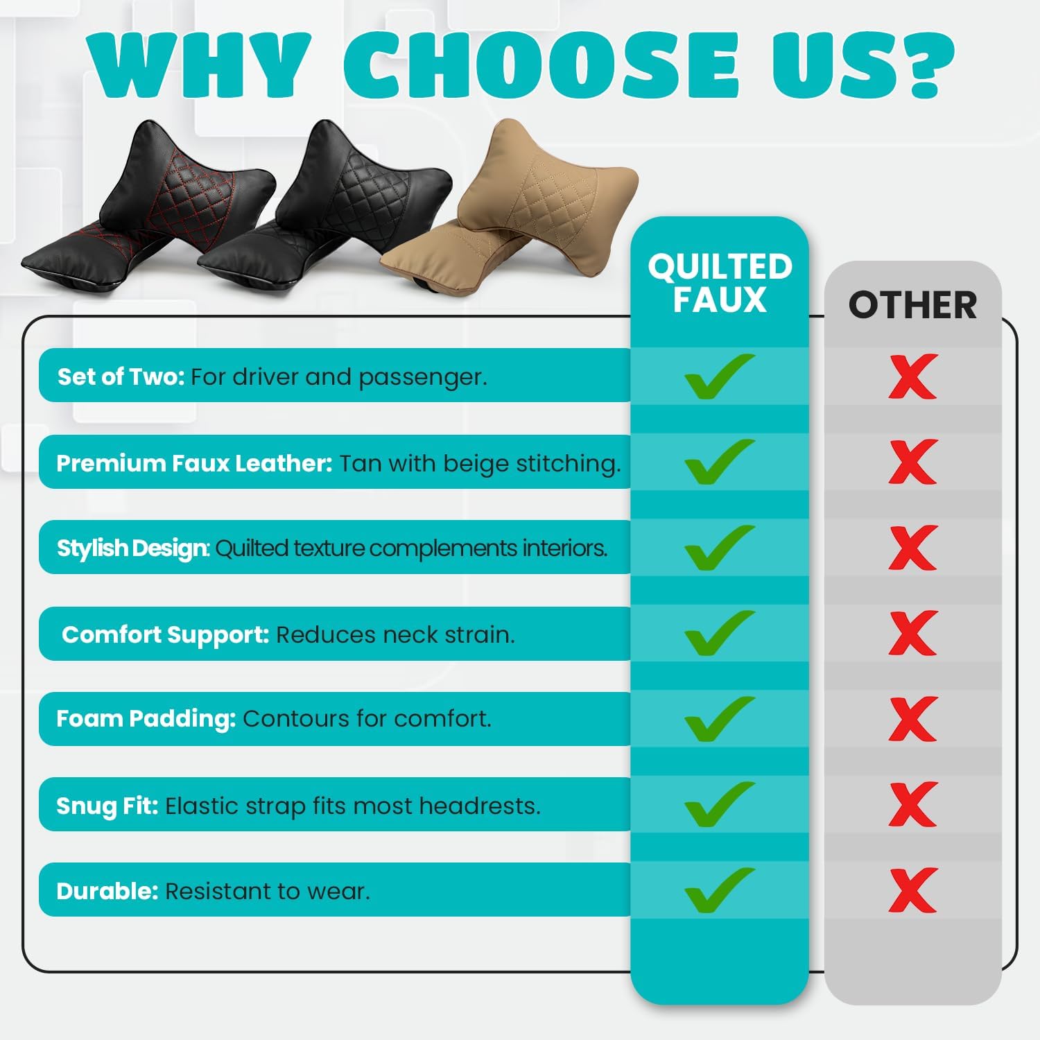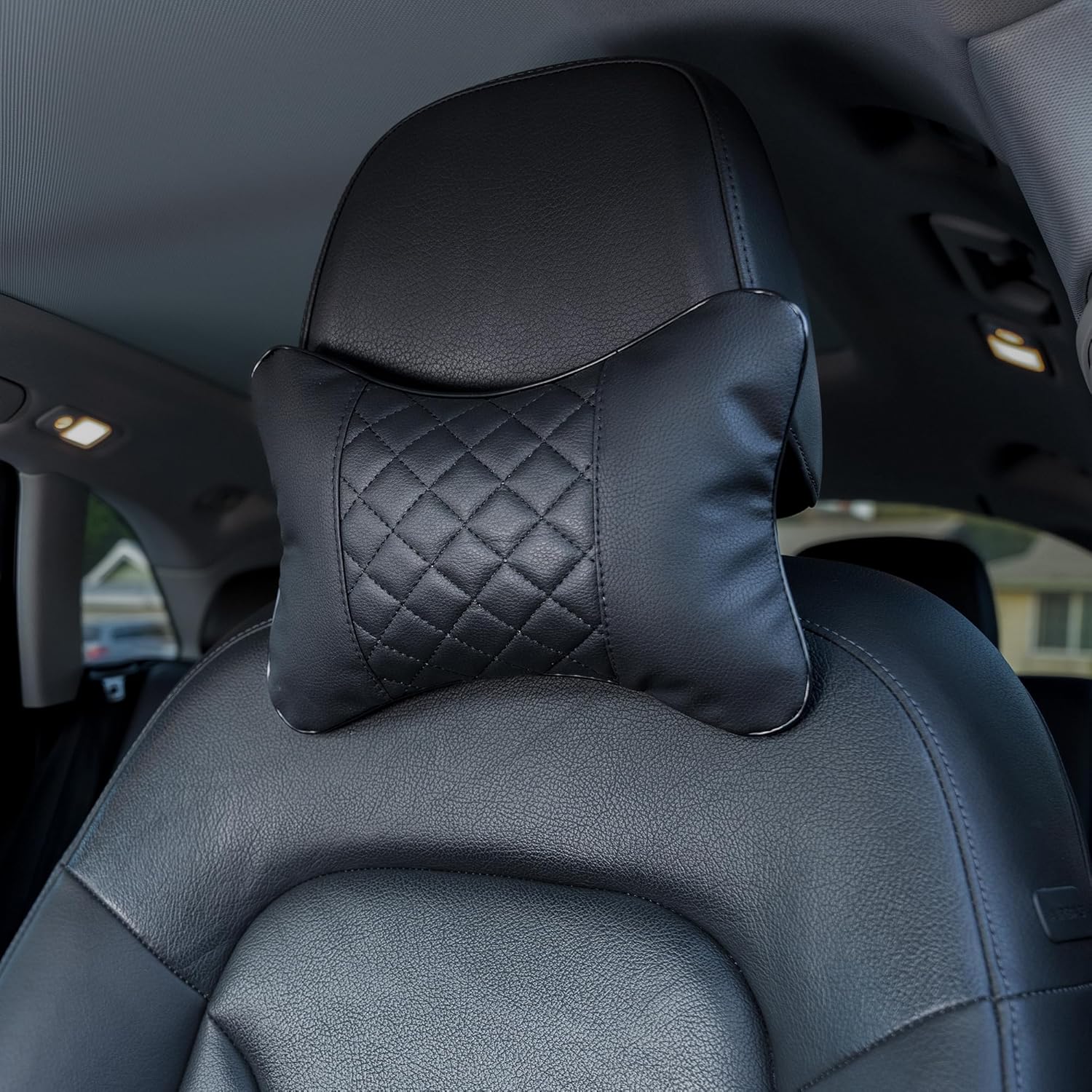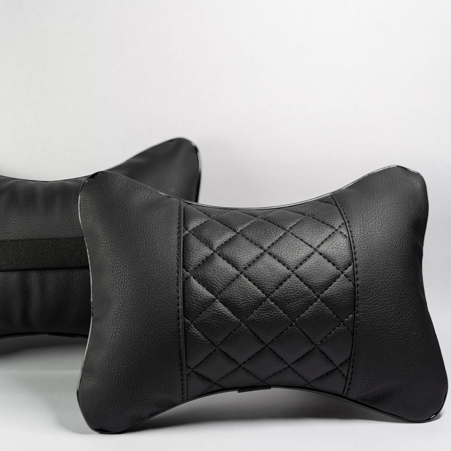 Quilted Faux Leather: Classic bone-style headrest pillows made from durable, quilted faux leather—adds both comfort and a refined look to any vehicle interior.