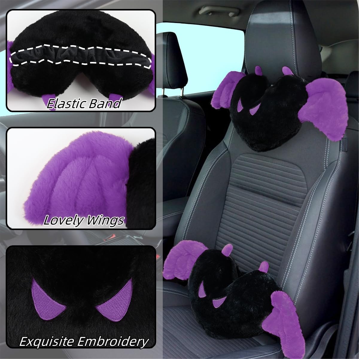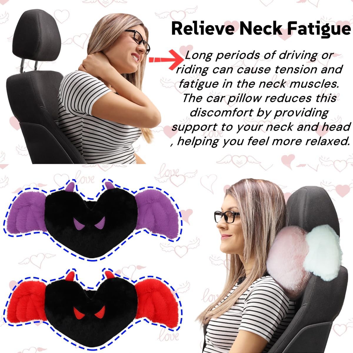 Cute Devil & Angel: An angel flutters her white wings, presenting you with a lovely smile. The devil extends his red wings, revealing a wicked gaze. Mixing pink with white and black with red is sure to make your car stand out with personality. The soft heart-shaped neck pillow not only provides comfortable relaxation but also brings the joy of touching cute things. Our love-heart car neck pillows effectively support your neck and head, combining practicality with visual appeal as a car accessory