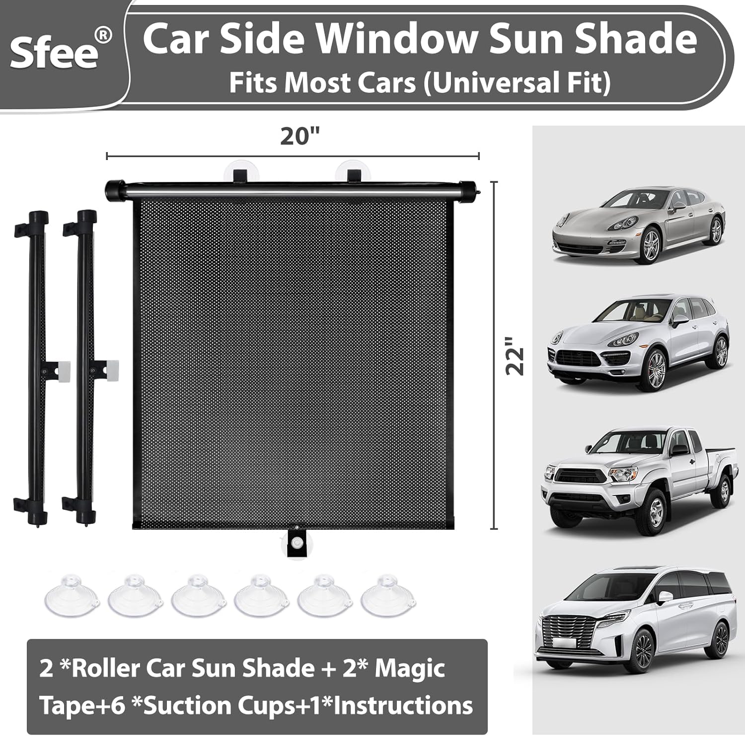 【Universal Fit Most Car Windows】Stay cool this summer with Sfee car window shades for side window ! Measures 20“ x 22”fit most car side windows. Perfect for cars, suvs, trucks and minivans and vans. Includes 2 retractable shades for full sun protection, with 6 suction cups and 2 Magic Tape for secure attachment.Features Retractable design adjusts to fit different window sizes,ensuring perfect coverage of the car’s side or rear windows,Keeps your car cool with full shade protection.