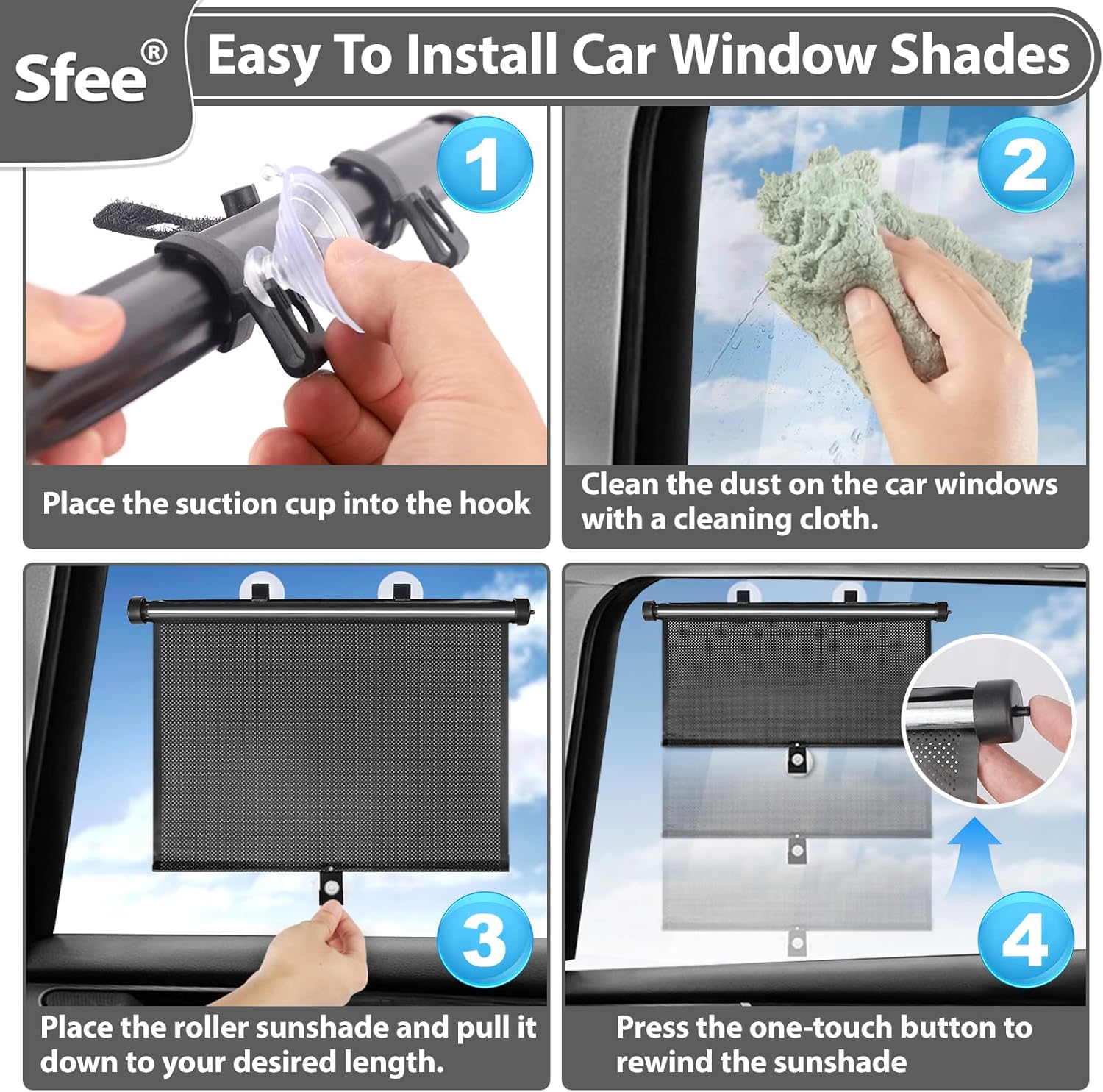 Easy To Install Car Window Shades In Seconds: 1.Place the suction cup into the hook ; 2.Clean the dust on the car windows with a cleaning cloth; 3.Place the roller sunshade and pull it down to your desired length; 4.Press the one-touch button to rewind the sunshade