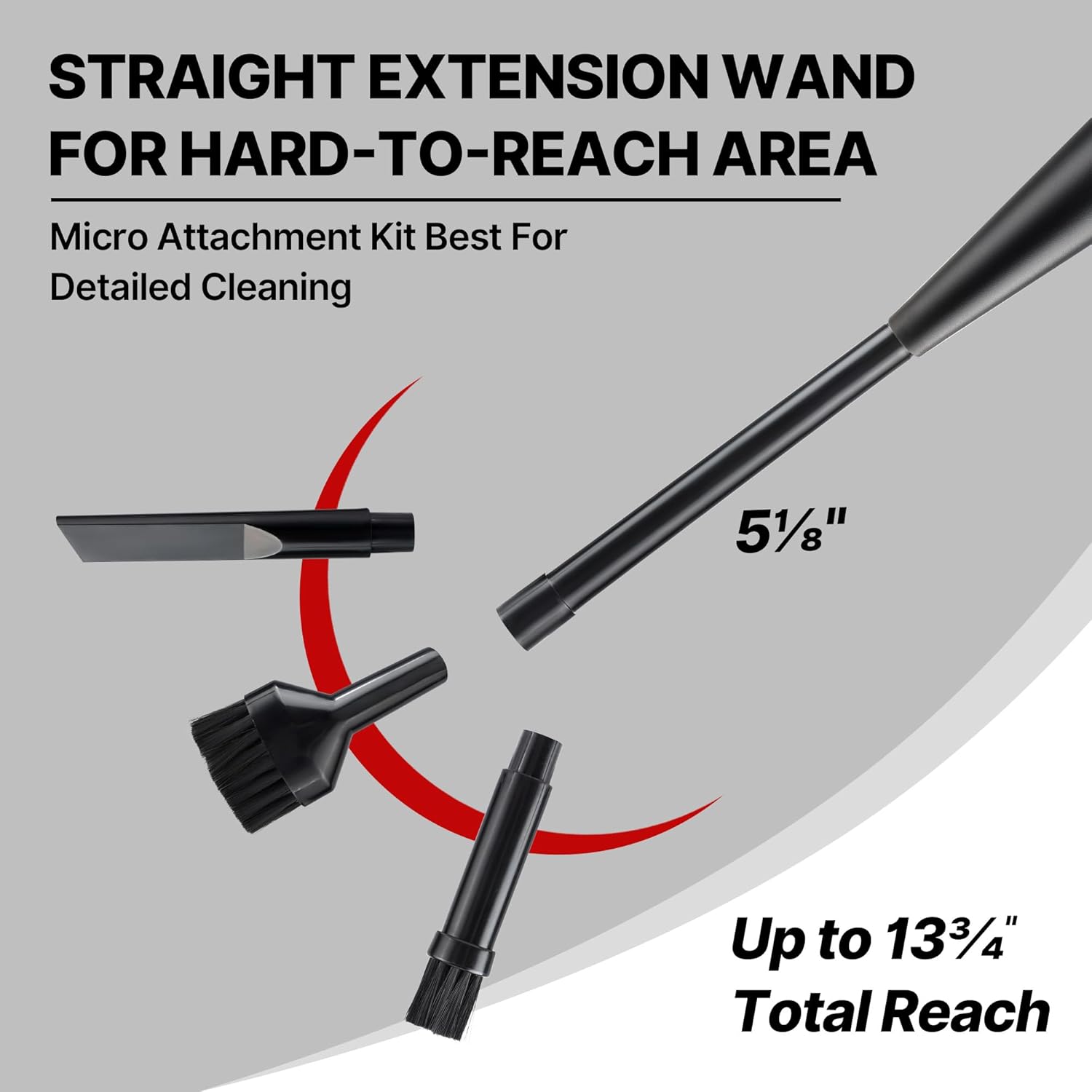 Kit Includes: Cone type adapter, straight extension wand, angled extension wand, round dusting brush, oval dusting brush and crevice tool
