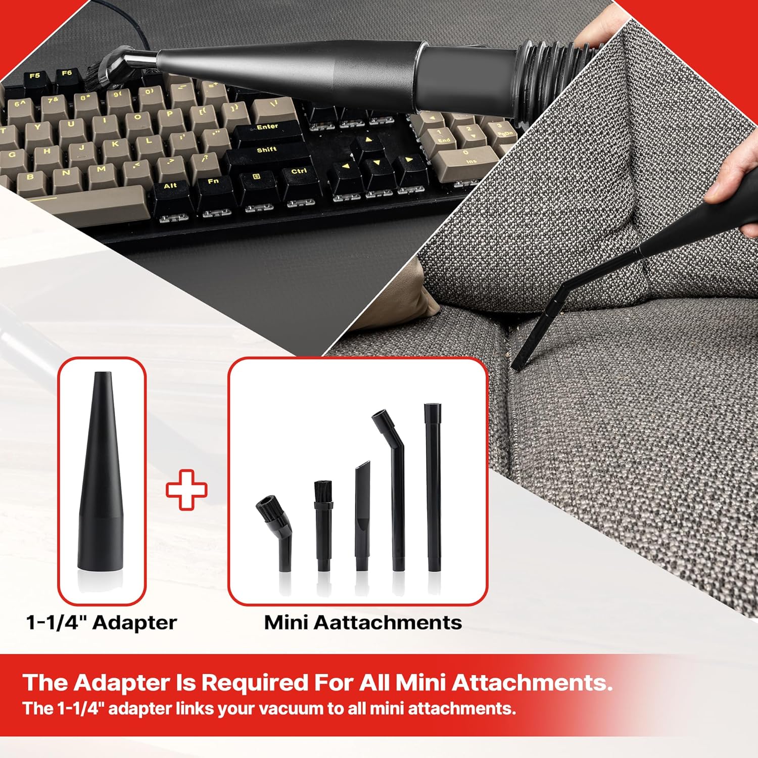 Note: The cone type adapter fits for shop vac with 1-1/4″ Outside Diameter hose and converts to fit the other 5 mini tools. Please make sure the Outside Diameter of your hose/wand is 1-1/4″, NOT Inner Diameter.
