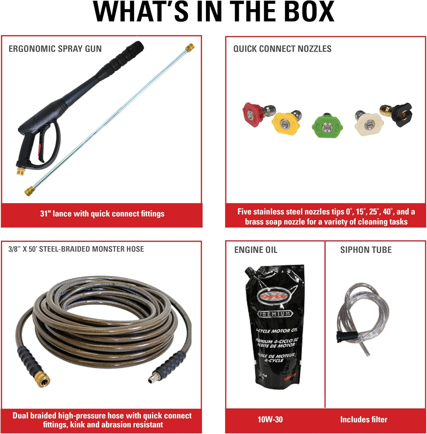 PRO PRESSURE WASHER ACCESSORIES: Five quick-connect pressure washer tips (0°, 15°, 25°, 40°, and soap nozzle) cover tasks from stripping paint to car cleaning; Professional QC spray gun with safety lock-out and 16″ spray wand included