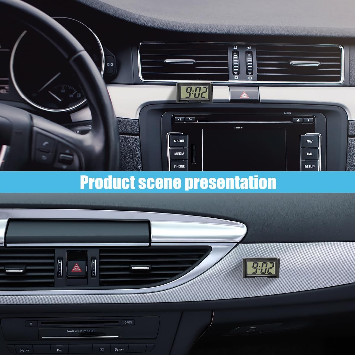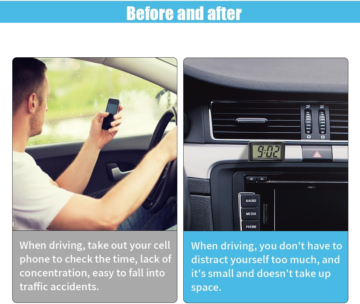 【Premium Materials】:The shell of the mini clock is made of high-quality ABS materials, sturdy, compact, and unbreakable. Large clear digital LCD for easy time reading and good visibility, adding a sense of simplicity to your car.
